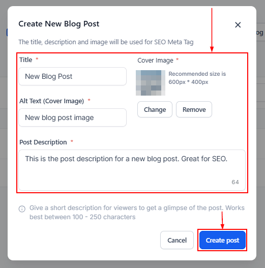 Begin by adding a Title, Cover Image, Alt text (Cover Image), and Post description to your blog post. Then click on the Create post button to continue.