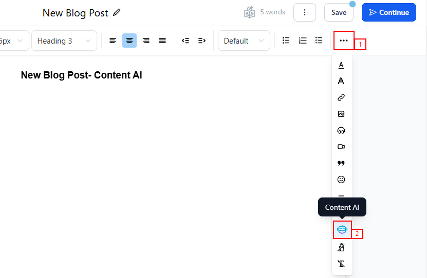 Within the blog post editor, click the three-dotted button (β¦) on the top left corner, there you will see that Content AI is available. Click on the Robot Icon.