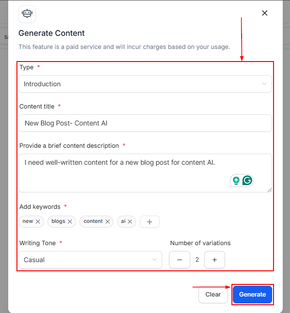 In the popup, fill out the requirements to allow the AI to generate the Content you need. Click Generate, and let the Content AI get to work.