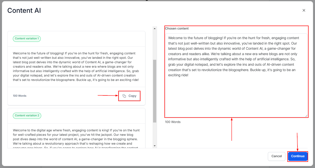 The number of Variations you chose will be generated. Click on Copy to choose the best-suited content, then click Continue.