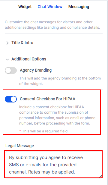 For SMS/Email Chat you can enable the consent checkbox for HIPAA compliance as well as a legal consent message.