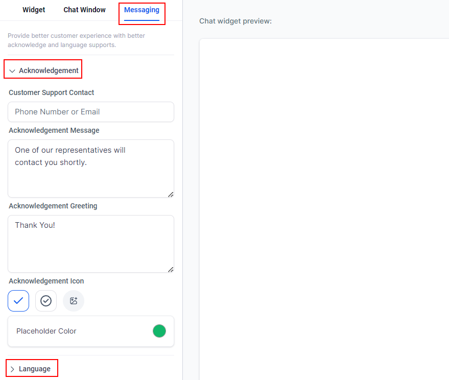 Here you can change the chat widget's language and the message it sends to acknowledge and finish a chat.