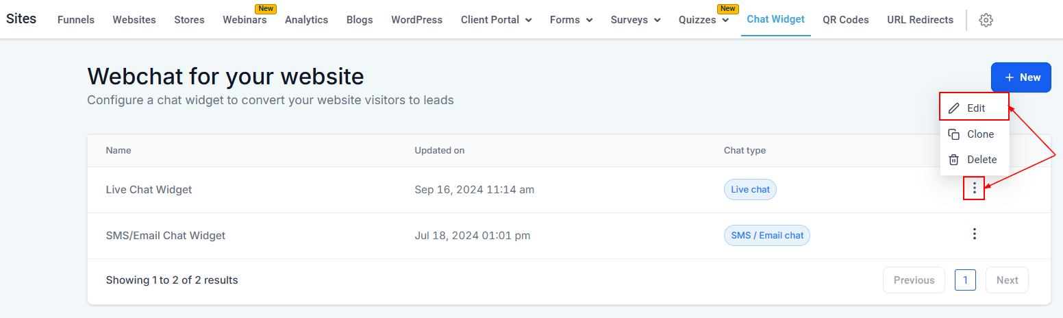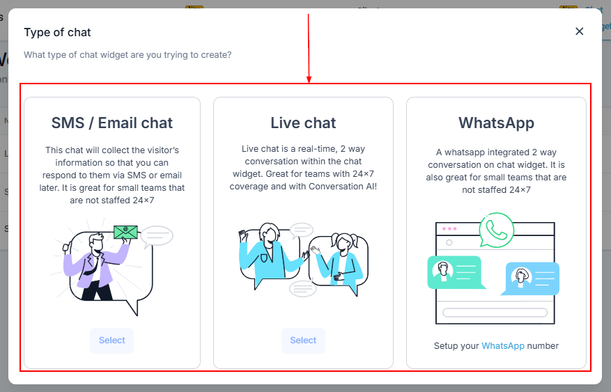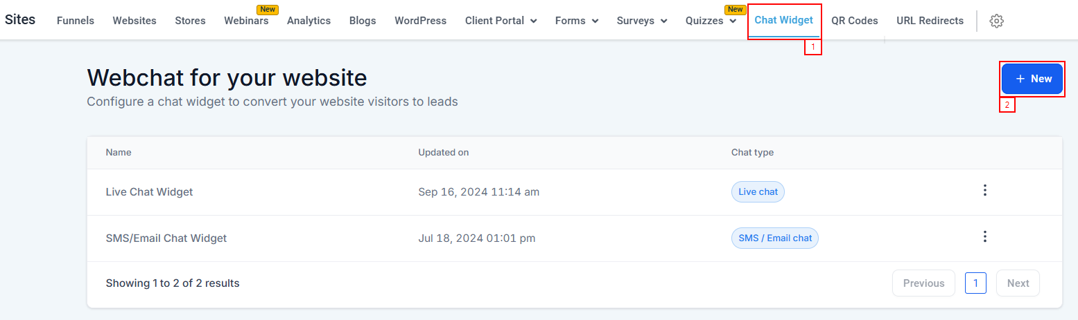 Inside the Chat Widget tab within the Sites section click the +New button. This will prompt you to select between the Chat widget types: SMS/Email Chats, Live Chat, and WhatsApp. By default a SMS/Email chat widget will be added to your list but you can add as many as you see fit.