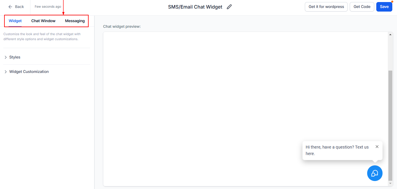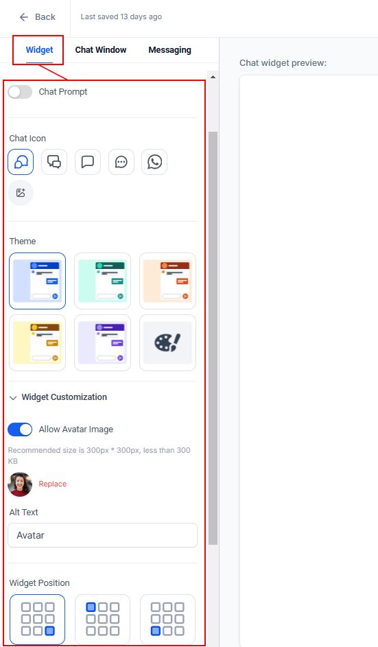 The customization aspect is divided into three tabs Widget, Chat Window, and Messaging.
