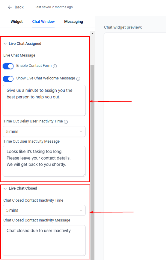 For Live Chat, you can customize messages for when a chat is assigned or closed. Under the Live Chat Assigned section, you can set the welcome message, inactivity timeout period, and the message shown when the user is inactive. In the Live Chat Closed section, you can configure the inactivity duration and the message displayed when the chat is closed due to inactivity.