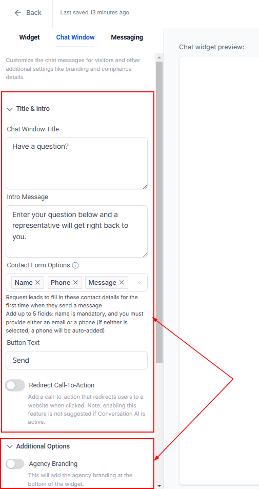 The Chat Window settings affect the user experience within the chat widget. You can customize the title, intro message, and contact form fields, such as name and phone. Additionally, you can enable or disable features like call-to-action redirects and agency branding.