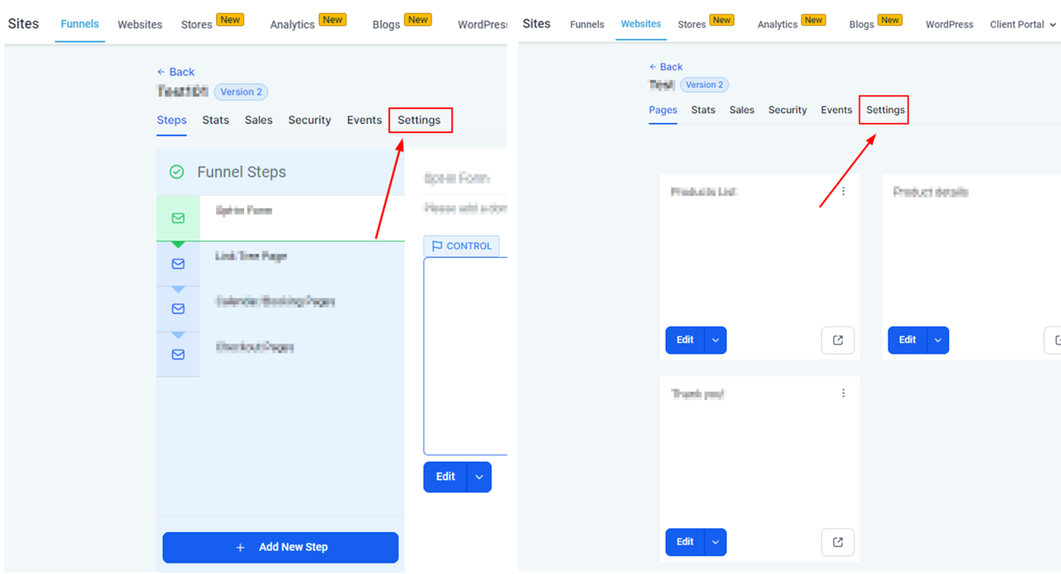 Inside the Funnel/Website general view select the Settings Tab