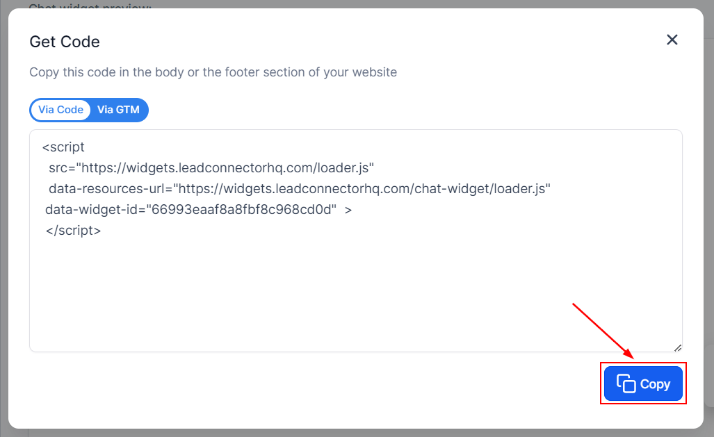 Inside the Chat Widget Builder click the Get Code button at the top right corner.