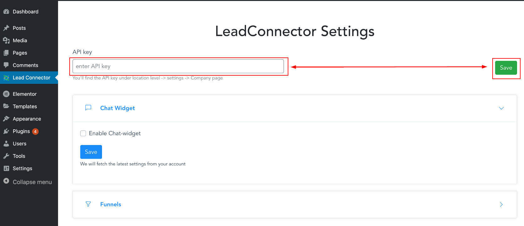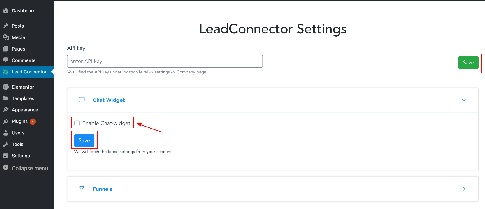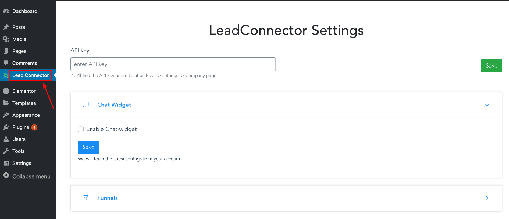 Head back to your WordPress and access LeadConnector on the left side Menu.