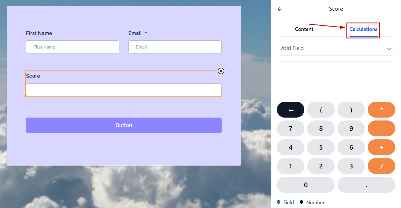 To set the formula the score element will follow, start by entering a number or field, selecting an operator, and entering a second number or field.