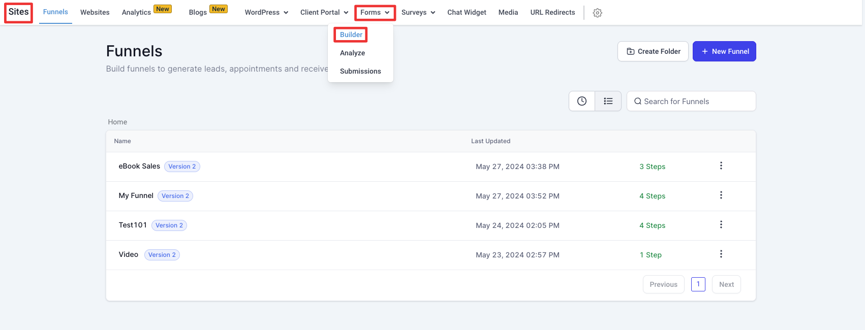 Navigate to the Form Section: Start by clicking on "Sites" in the left sidebar of your CRM dashboard. Then, head to "Forms" on the top menu and select "Builder".