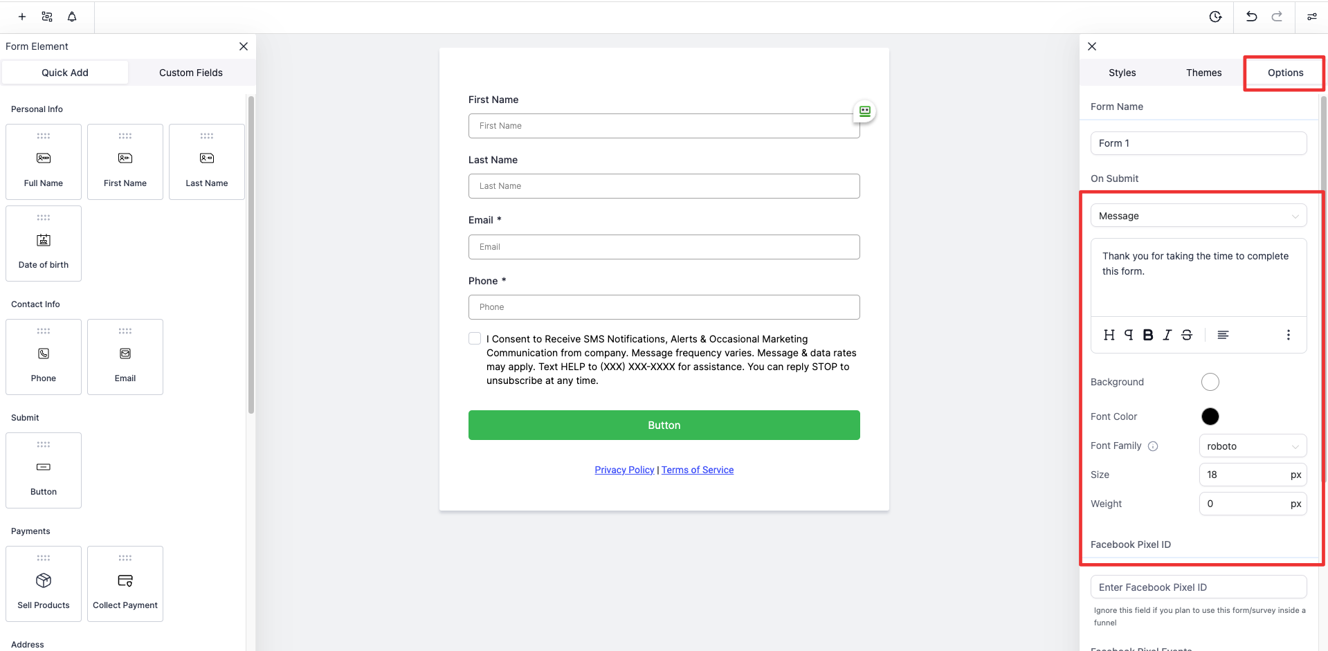 Post-Submission Actions: In the Options tab, decide what happens after a client submits the form. You can choose to display a message, which you can customize right there.