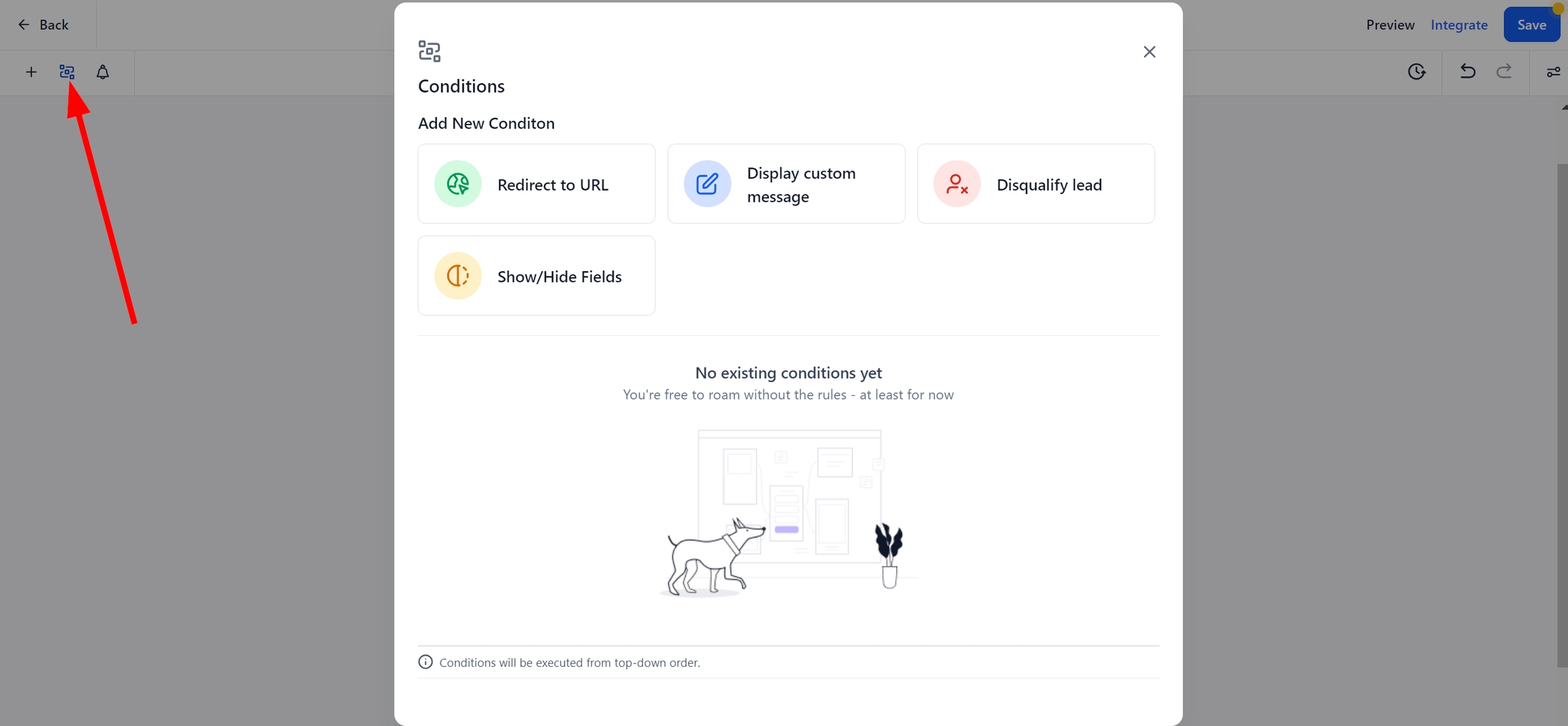 Once your questions are in place, initiate conditional logic by clicking the βAdd Conditional Logicβ icon on the upper left hand corner.
