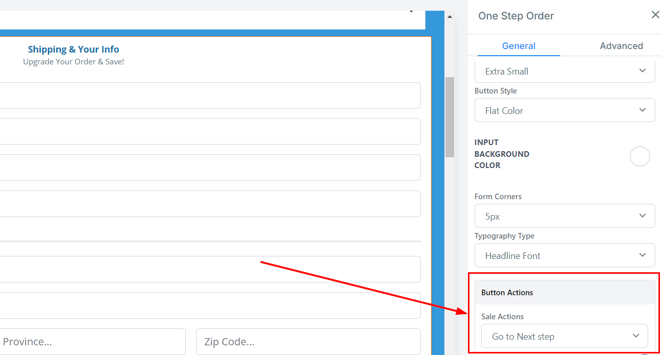 Under Button Action, you have the option to choose between going to the next step, a website URL, or to another step within the funnel or website.