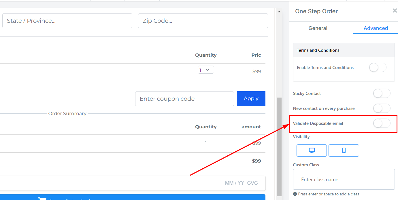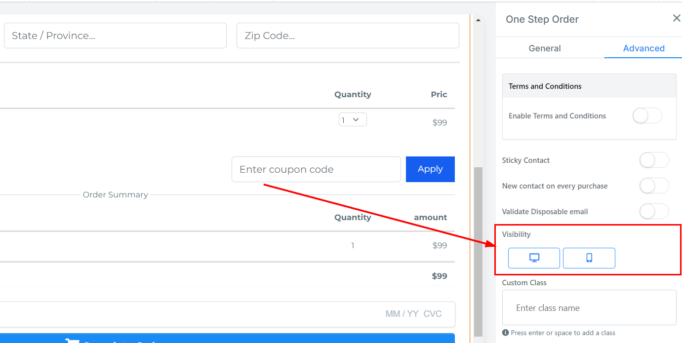 You can decide if you want the order form to be visible on only mobile devices, desktops, or both by clicking on it to highlight the icon.