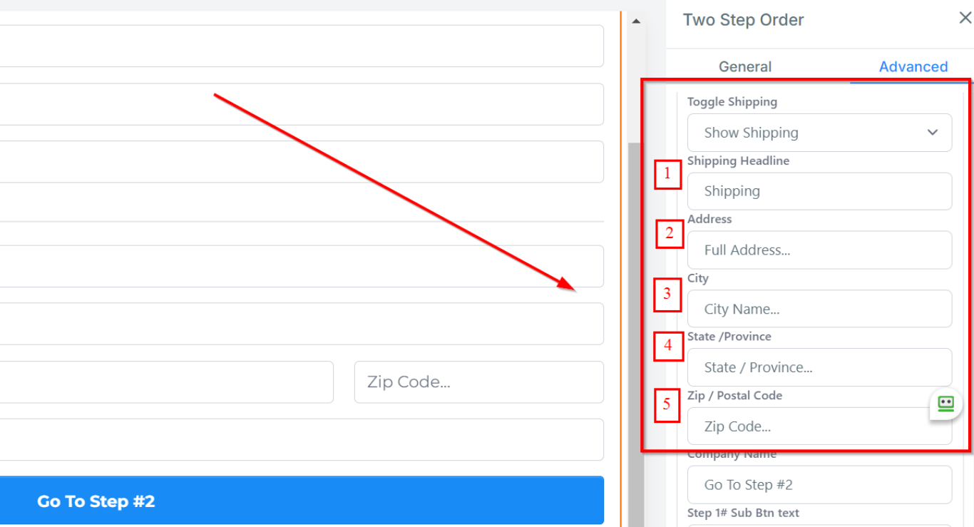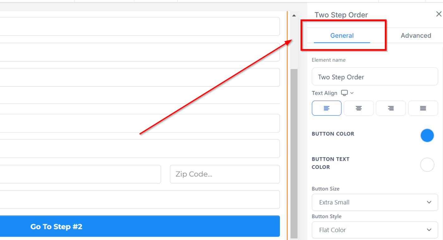 You can use the 2-Step Order Form to get the contact information and shipping details of your customer. For this element, you will have the Shipping details and the information in two separate sections. Select the element to open its settings on the right hand side of your builder.