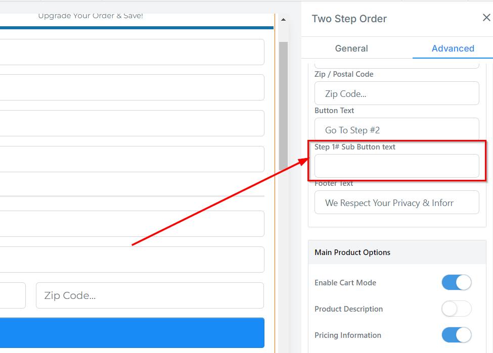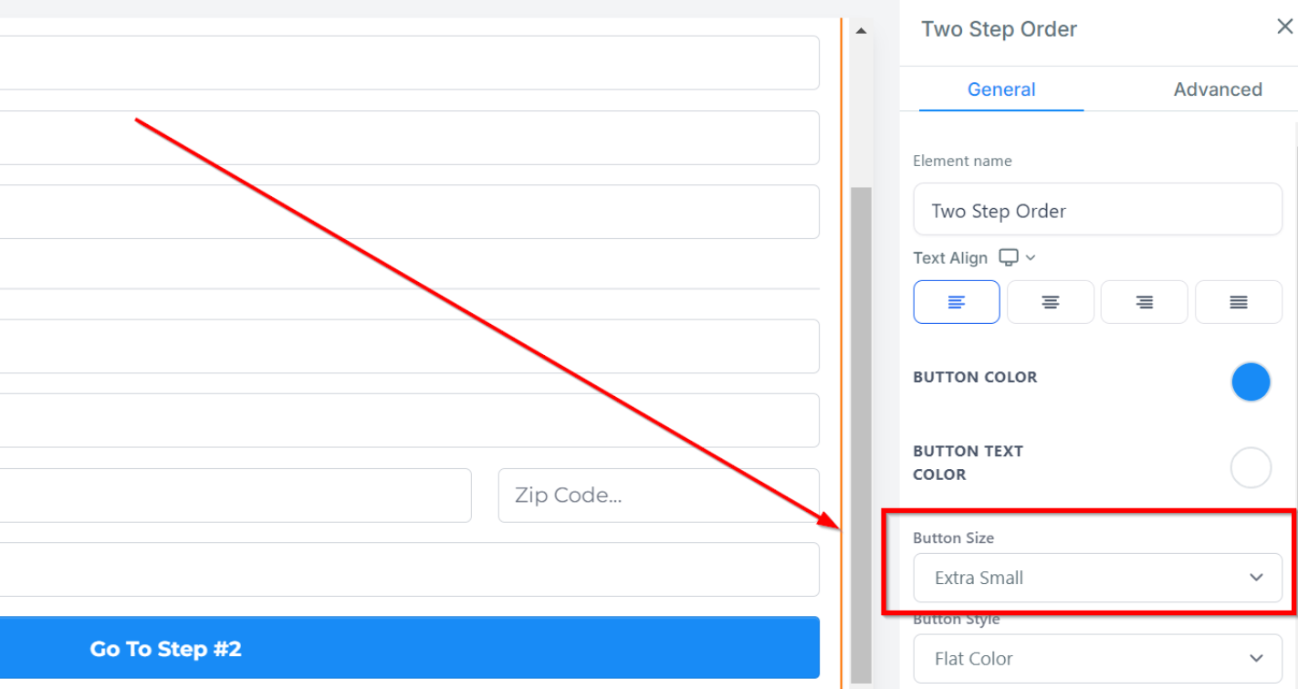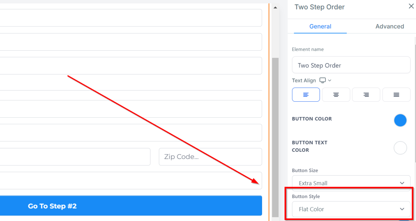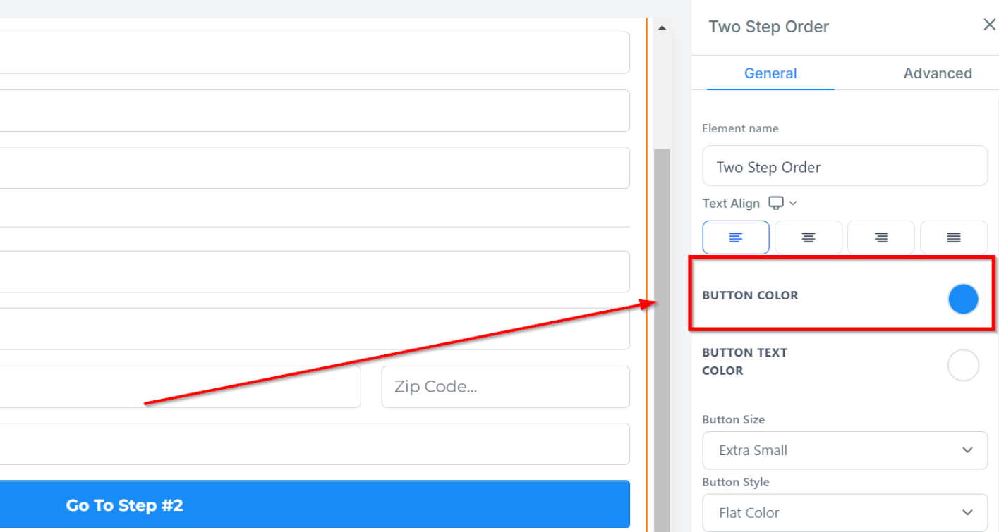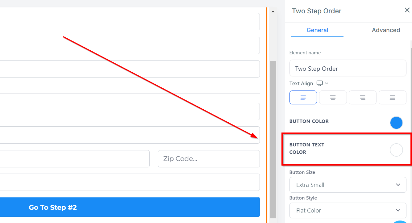 Under Button Text, you can customize the text displayed that allows customers to navigate to step 2 of the order form.