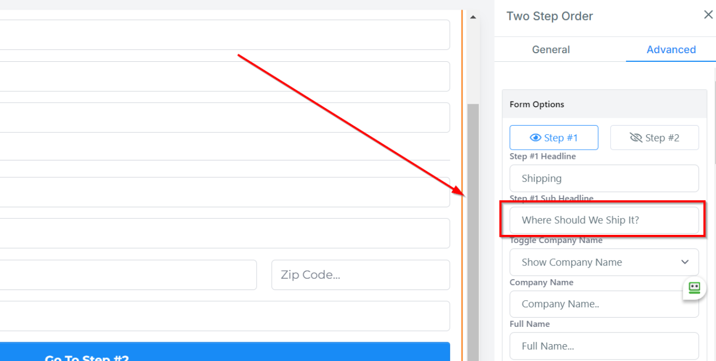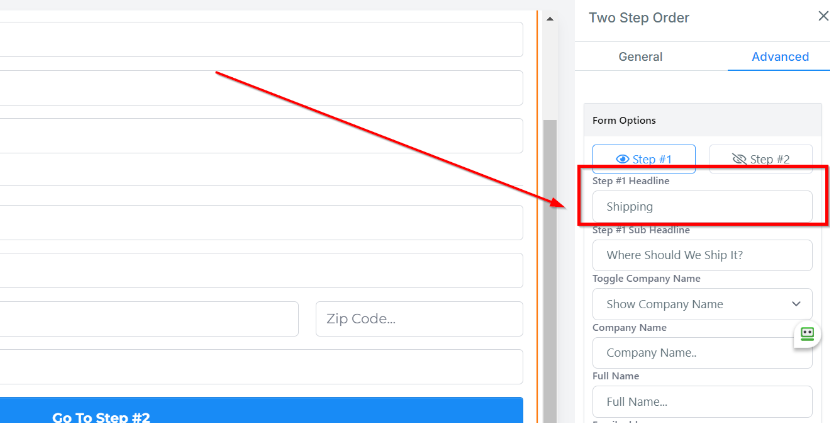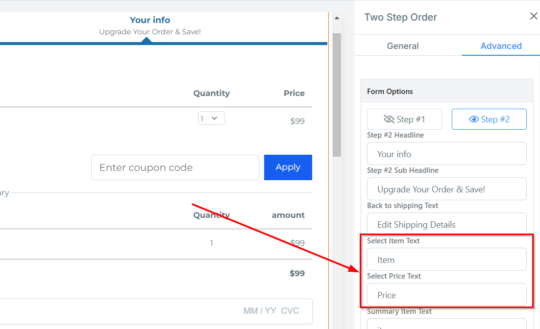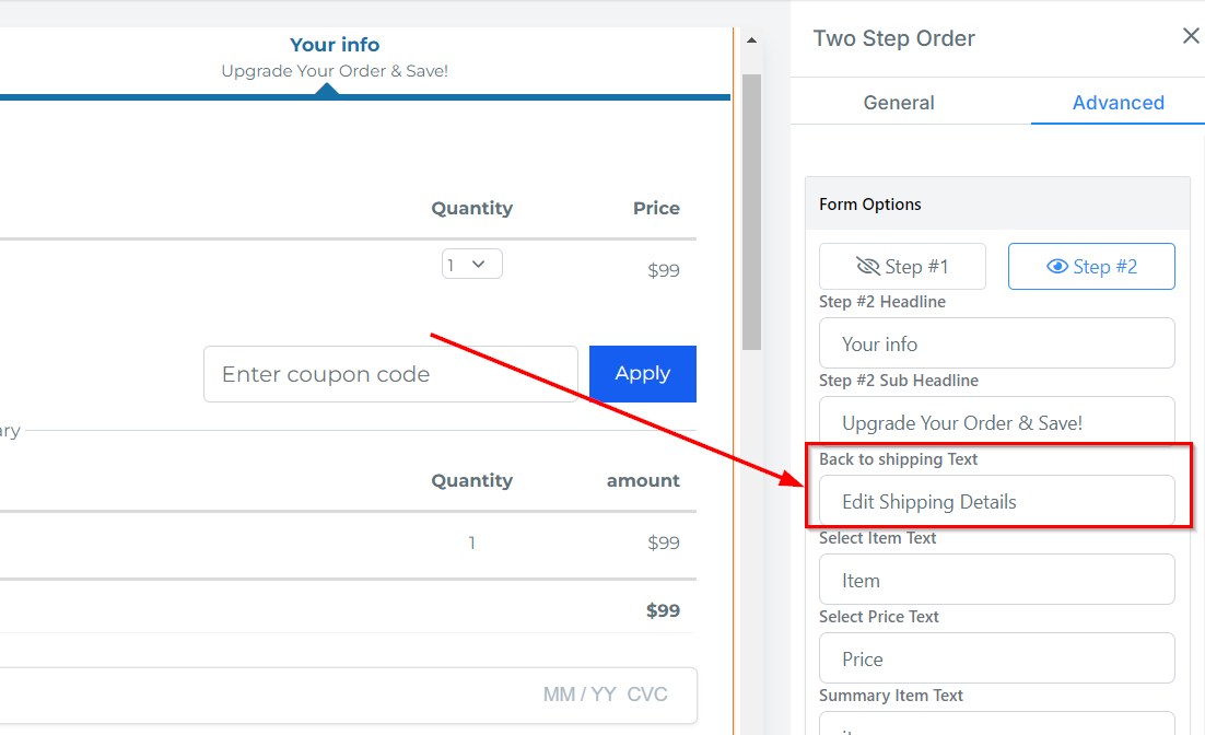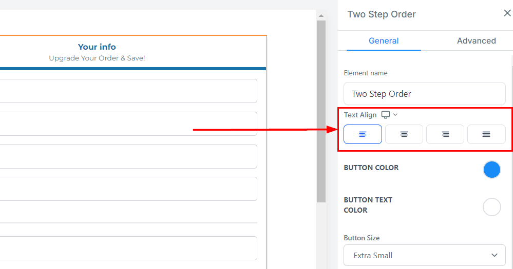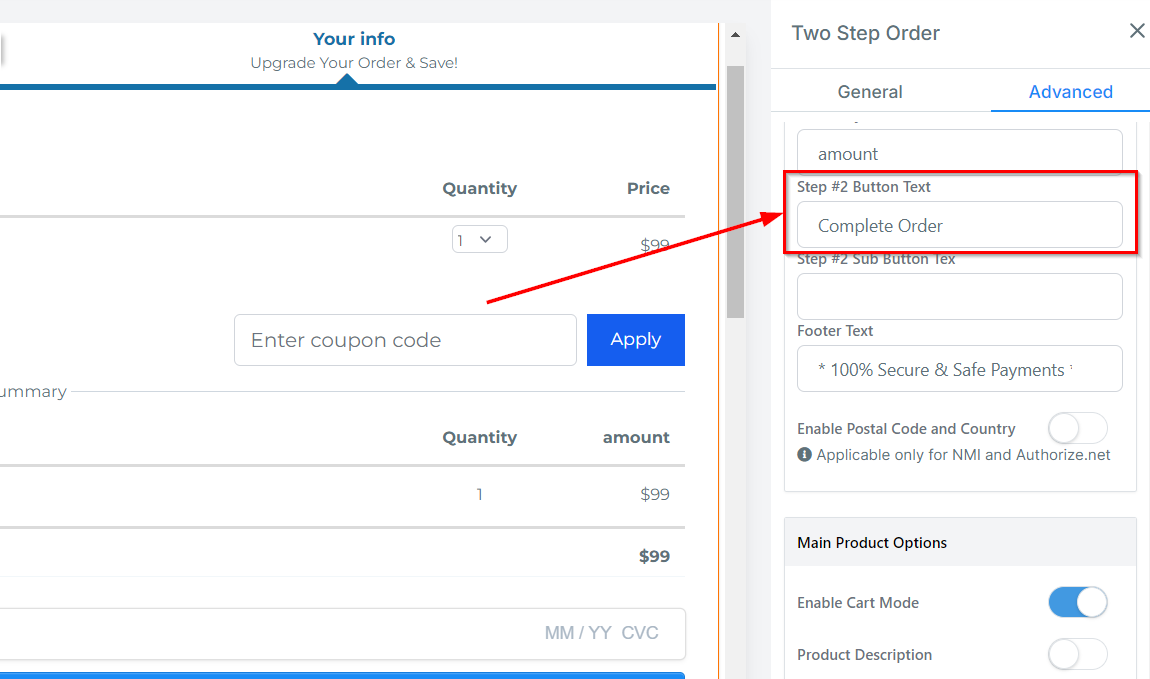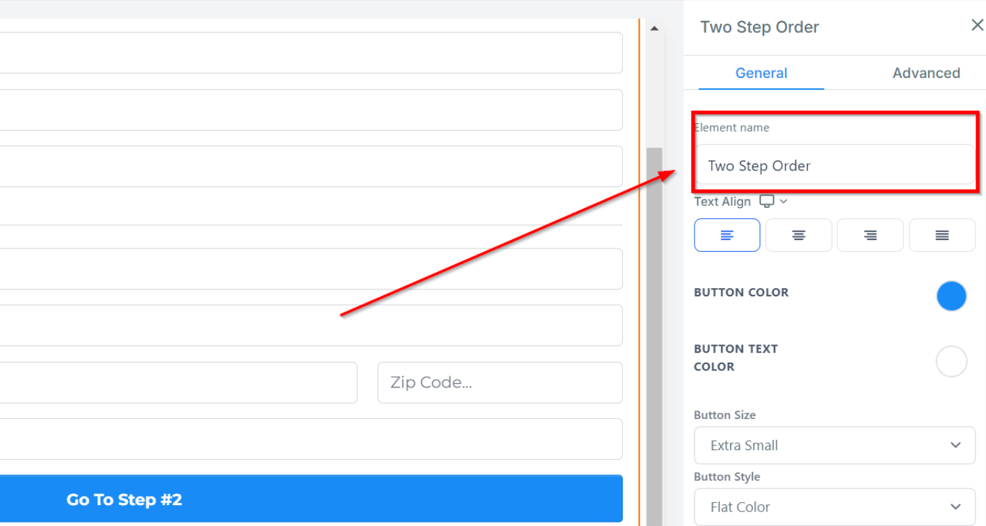 Under Button Text, you can customize the text displayed that allows customers to navigate to step 2 of the order form.