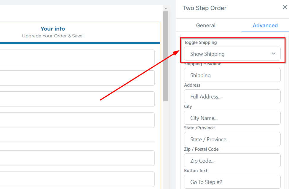 You can choose whether to display or hide the form field for Shipping info using the Toggle Shipping feature. If you have shipping info toggled on, you will have options for those fields.