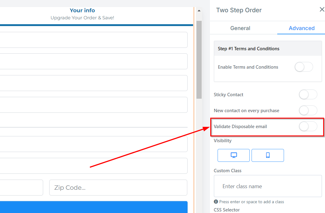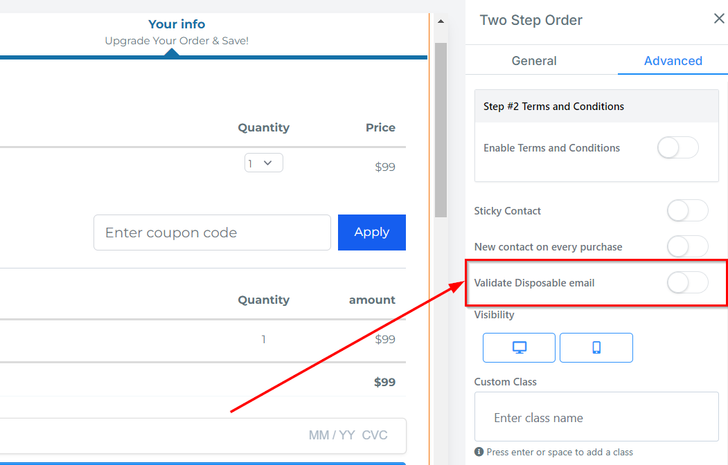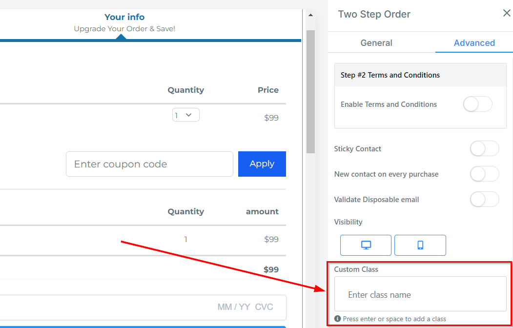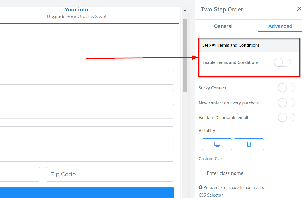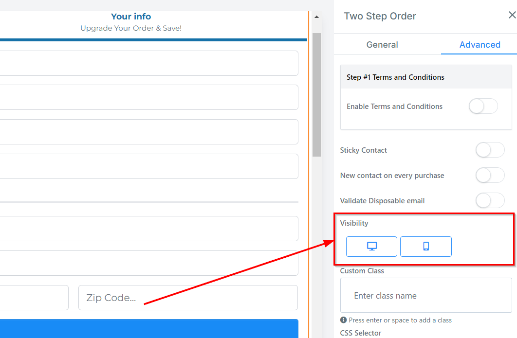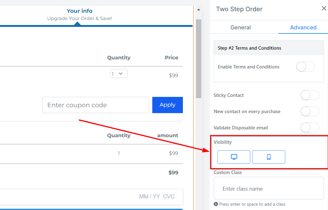 You can decide if you want the order form to be visible on only mobile devices, desktops, or both by clicking on it to highlight the icon.