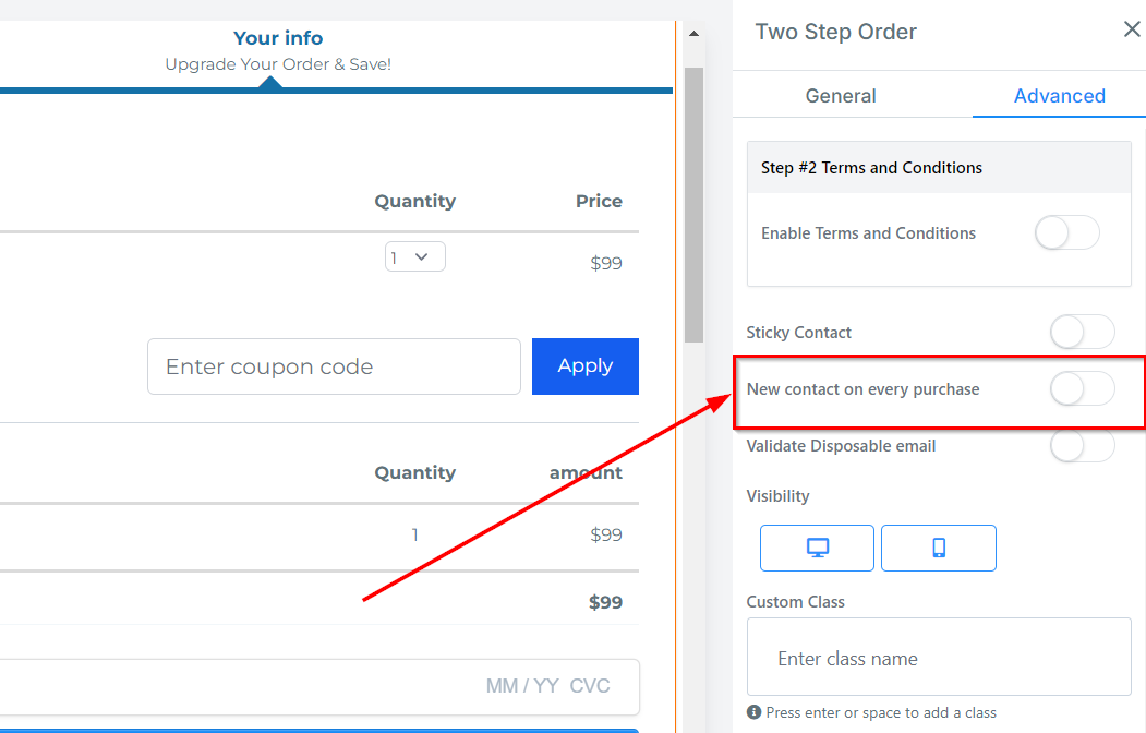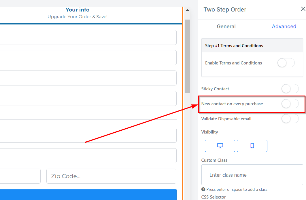 To create a new contact for every purchase, toggle on or off the New Contact on the Every Purchase feature.