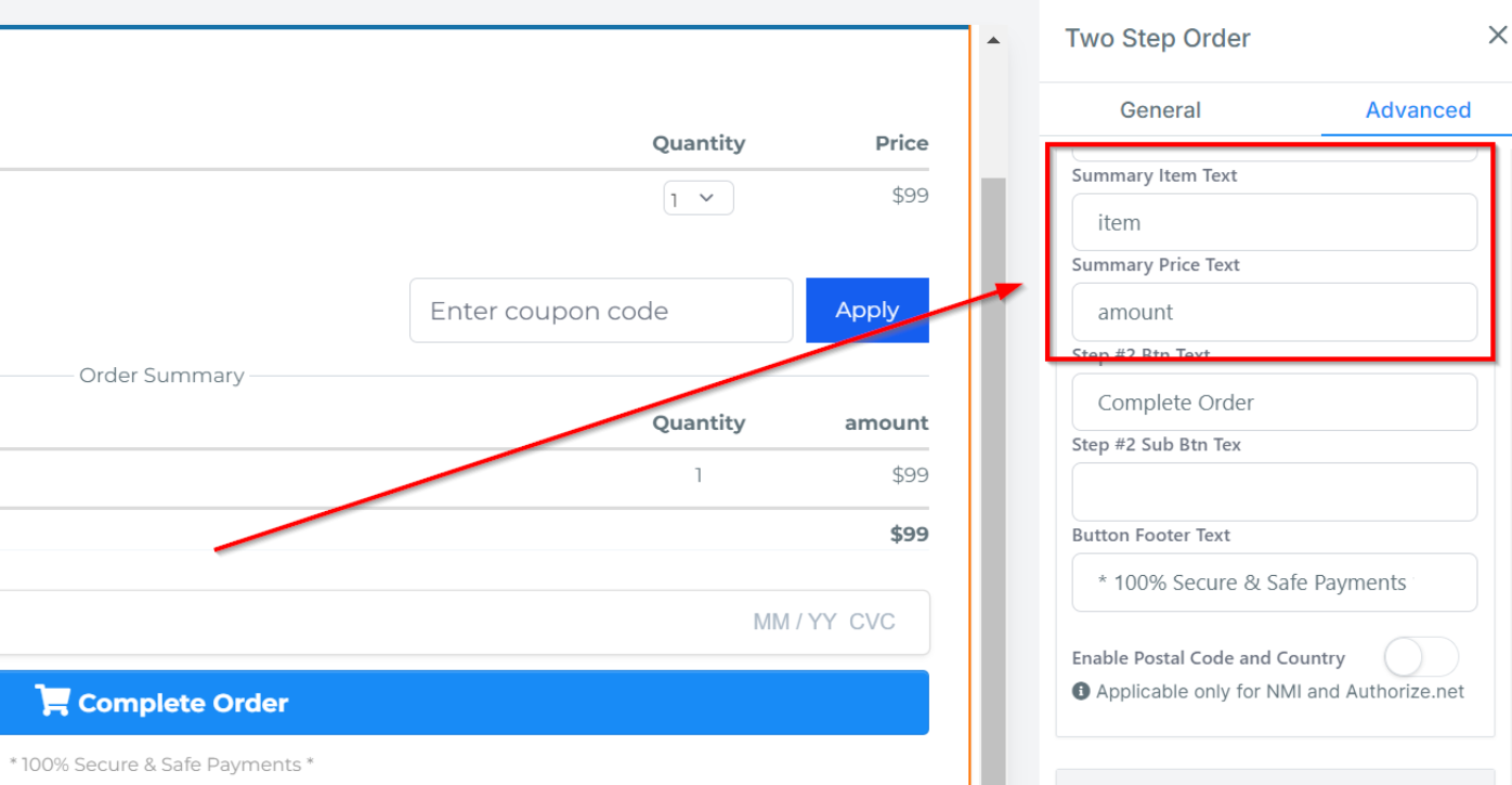 You can edit the description in the Order Summary for the Item and price form field here.