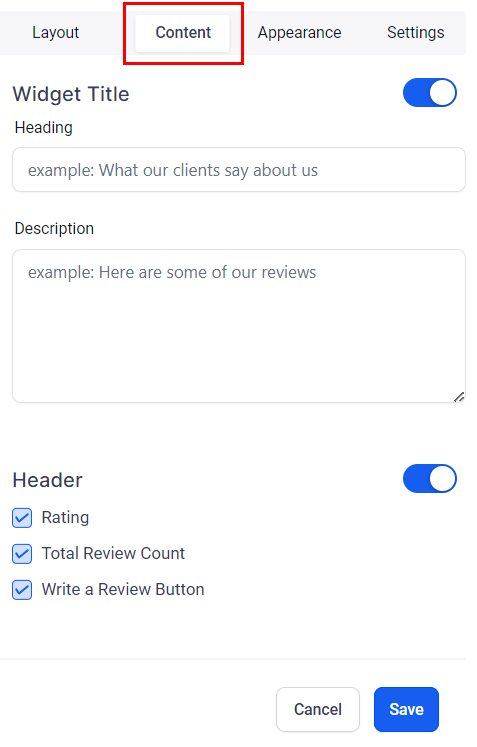Content: Input your widget's title and description. In the header section, you can enable or disable the overall rating, total review count, and the "Write a review" button.