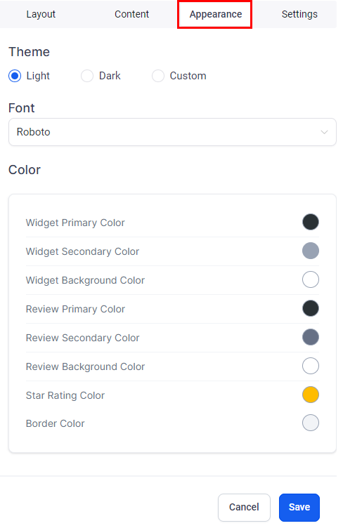 Appearance: Select from Light, Dark, or Custom themes. With the Custom option, you can tailor the colors of the heading, reviews, stars, and background to fit your brand.