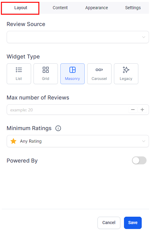Layout: Choose your preferred widget type, select the review sources (e.g., Google My Business or Facebook), set a maximum review display limit, and decide if you want to show a "Powered by" message.