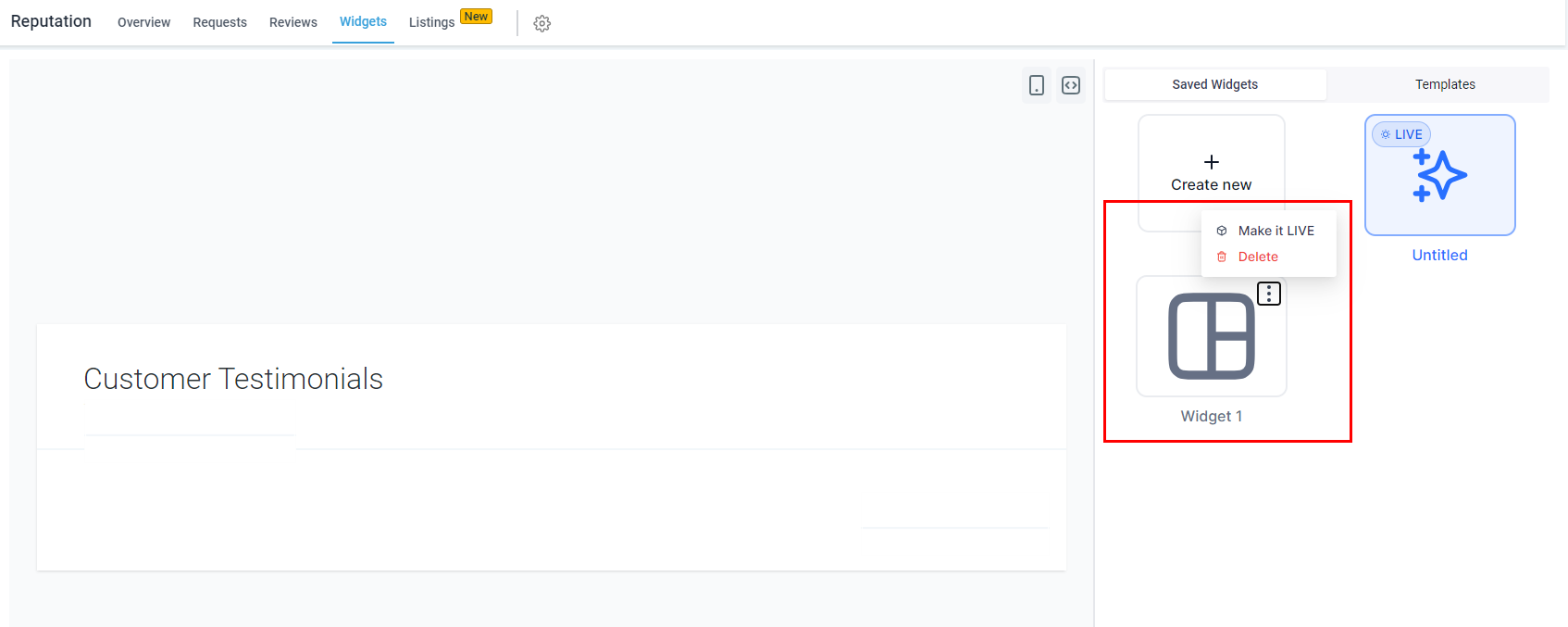 On the right, you'll see options to create a new widget or choose from upcoming templates.