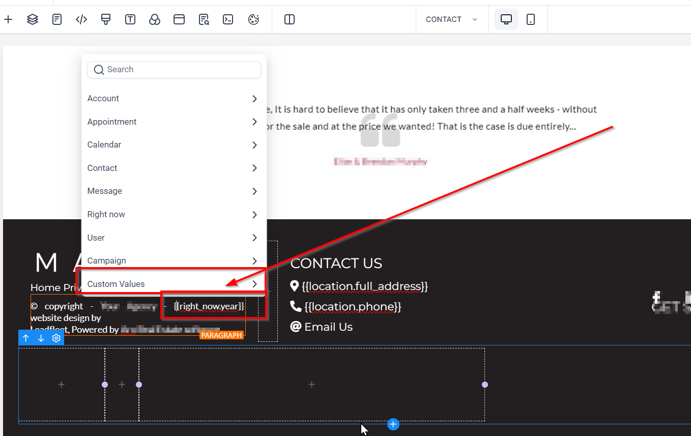 Implement the Merge Field: Once you've identified the correct page, you'll need to add a text element and insert the βRight Now- Yearβ custom value into your template or web page using the Custom Value icon. If you're updating the footer on your website, replace the hardcoded year (e.g., 2021, 2022) with the field you've identified using the custom value.