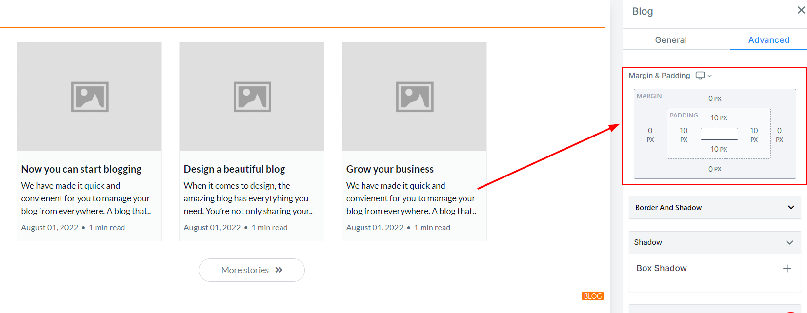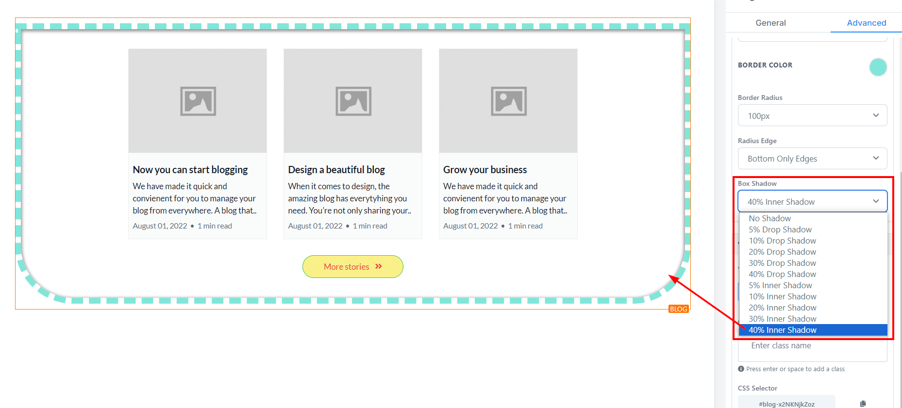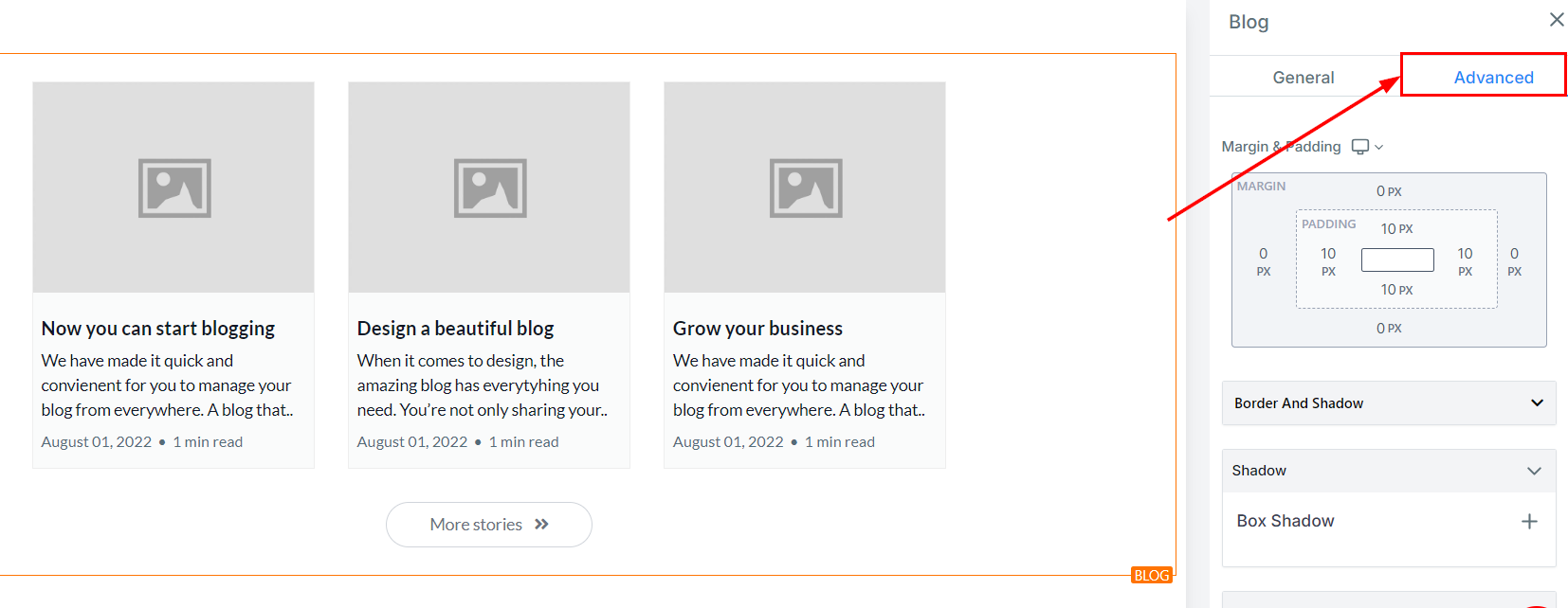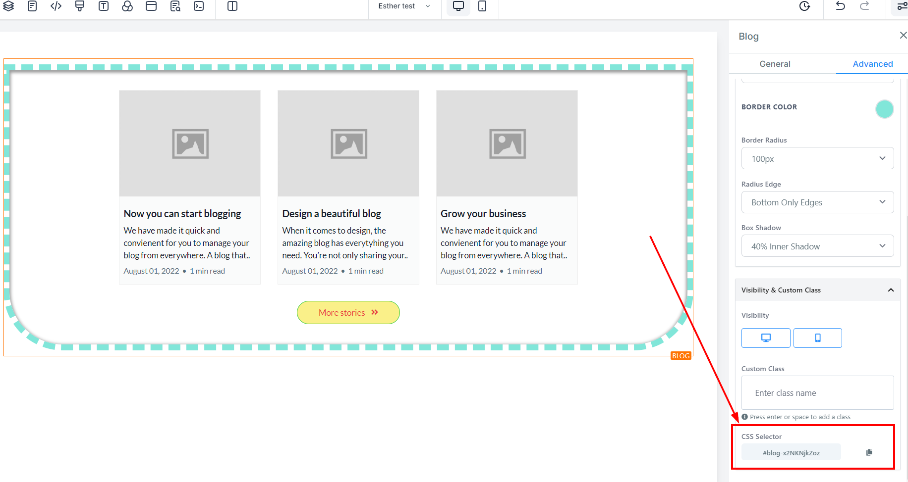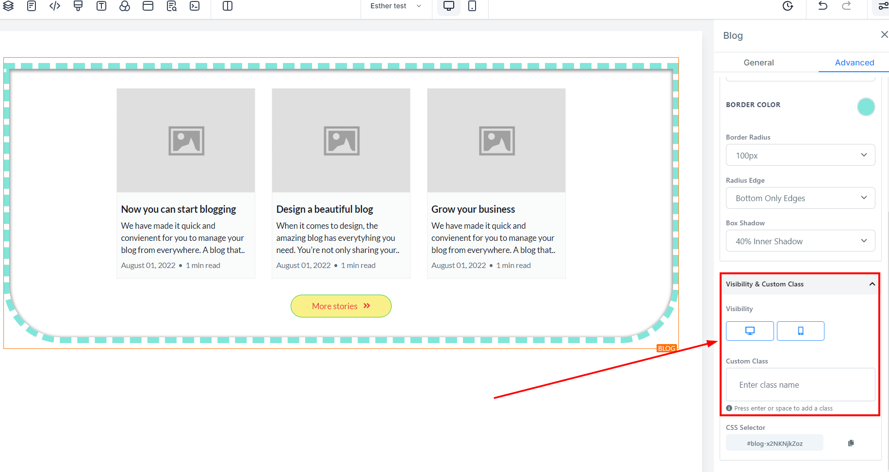 Advanced Settings provides several options to customize your blog post element. Here you have spacing options, the ability to add borders and shadows, as well as adjust visibility and add Custom CSS.