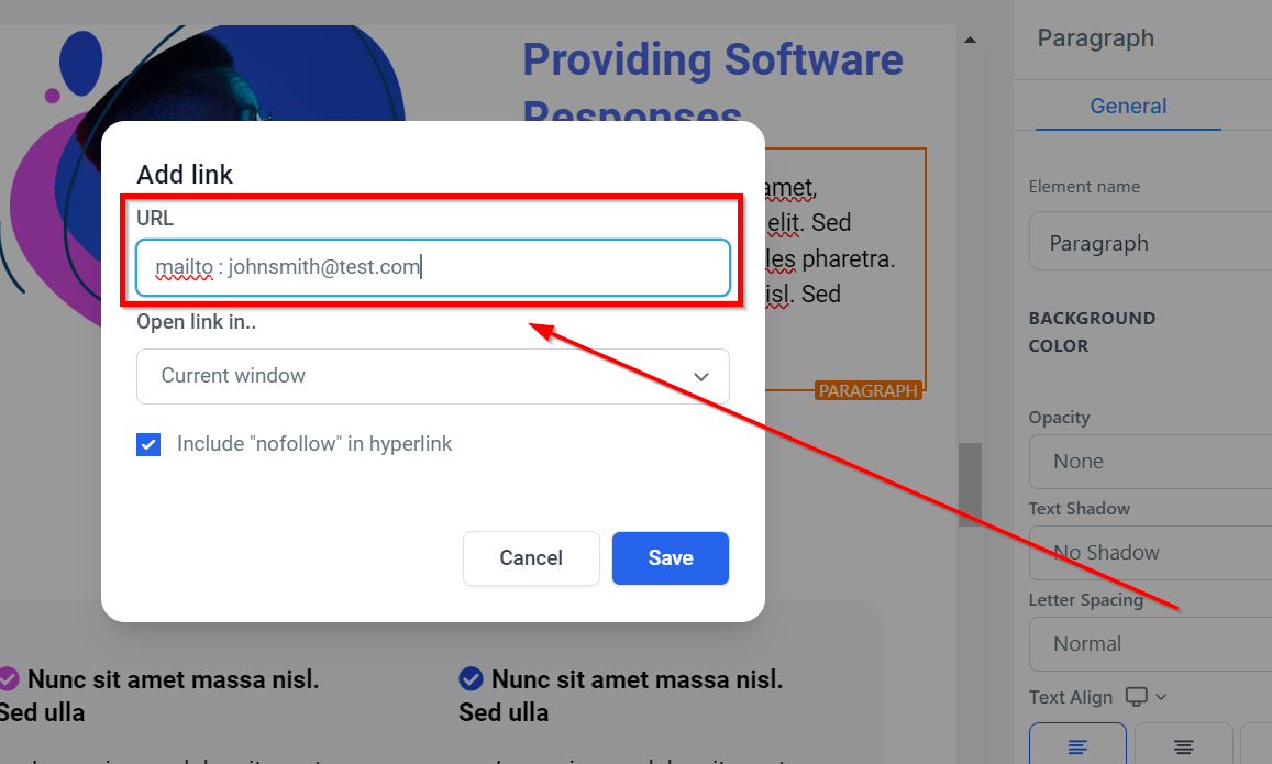 In the link URL field, type mailto: followed by the email address you want users to send emails to (e.g., mailto:[email protected]).