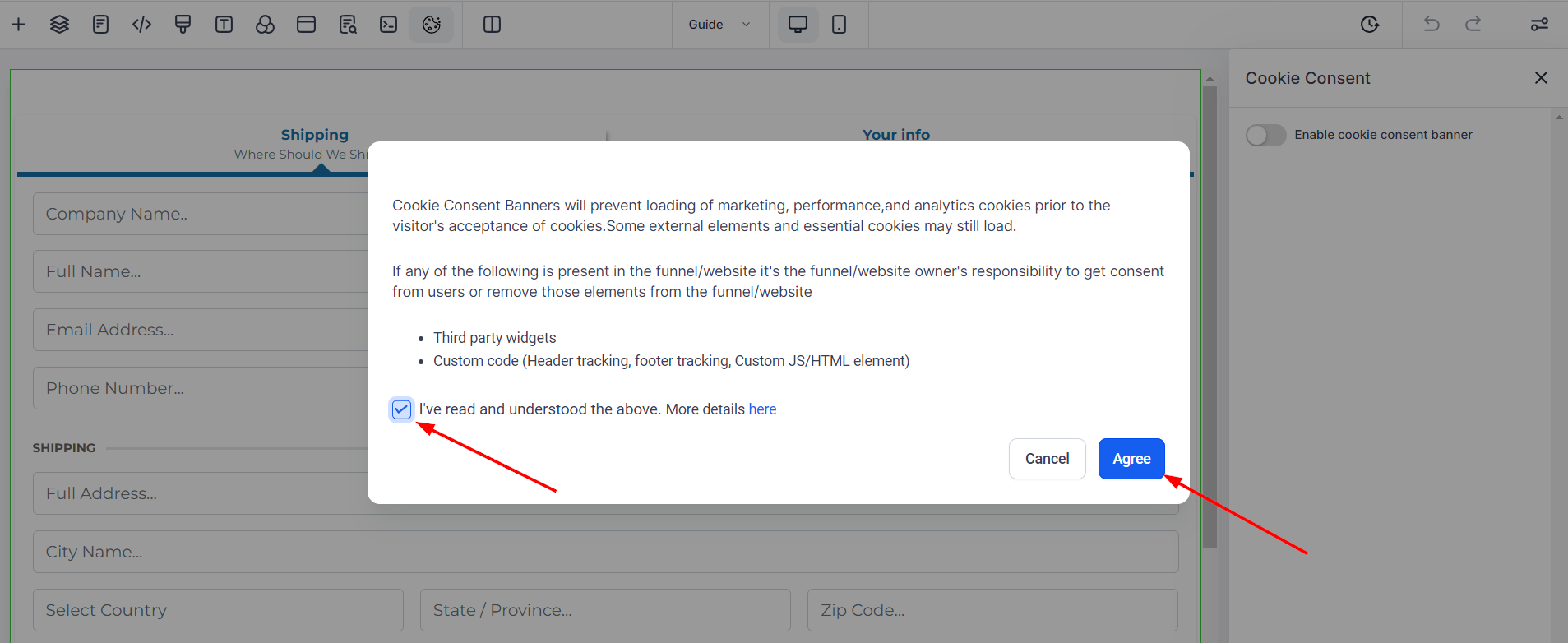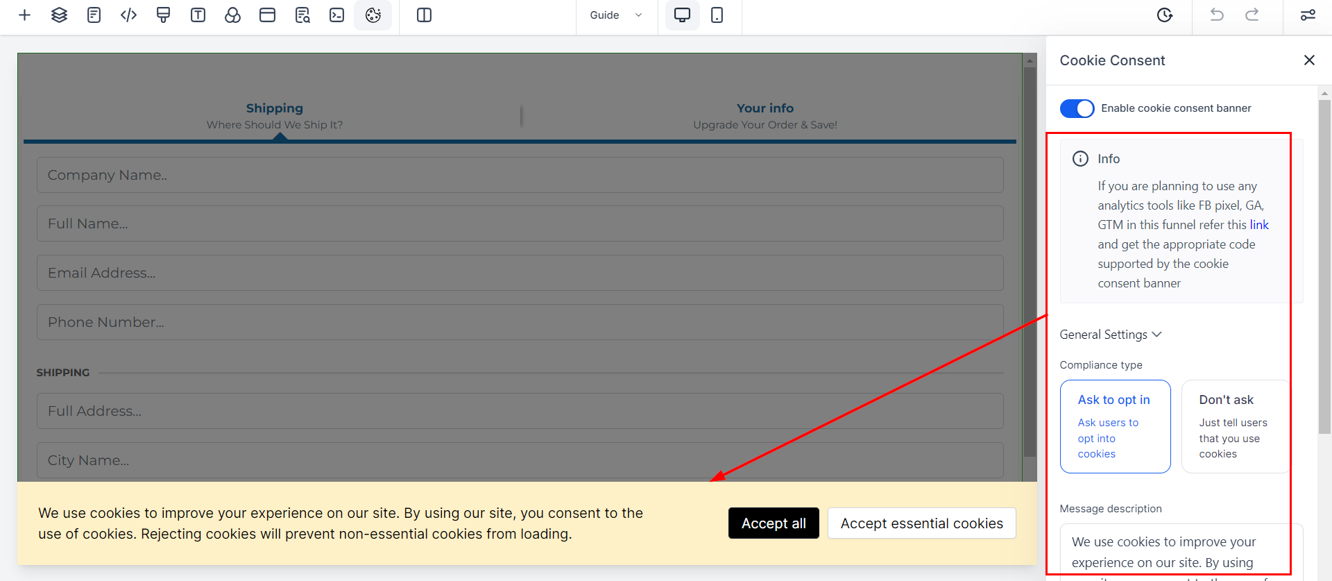 Verify that the banner appears on your site or funnel and that it includes options for users to accept or manage cookie settings.
