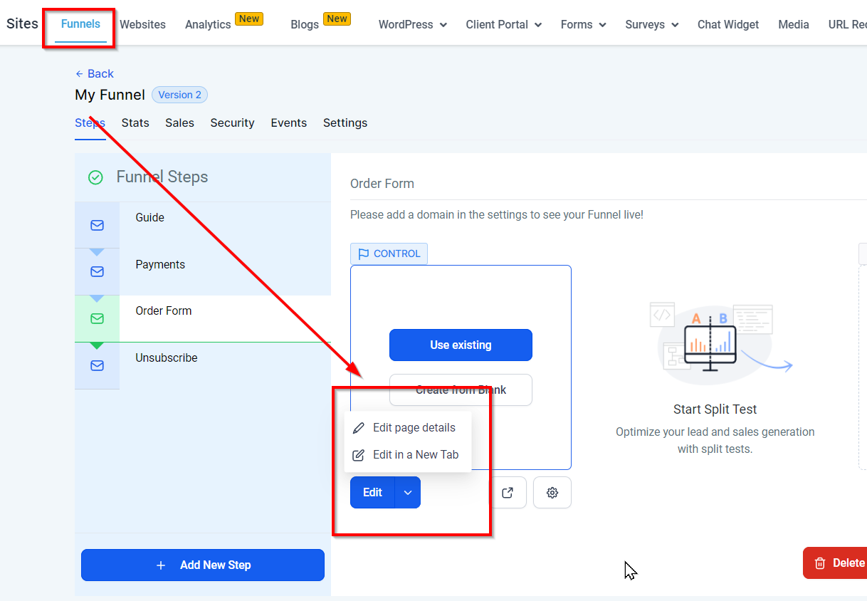 Open the Funnel Editor: Start by selecting a funnel, then "Edit Page" to access the funnel editor.