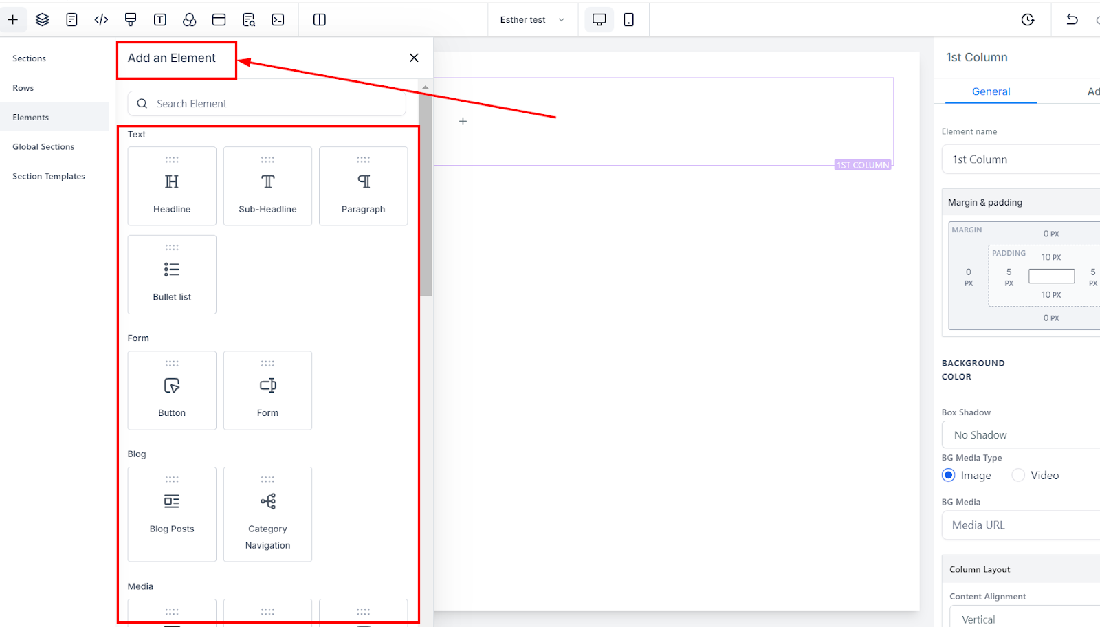To add elements to your page, click on the add element option in the Element editor located on the upper right side of the taskbar.