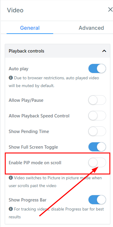 3. Enable PIP Mode: Locate the video element settings and find the toggle for "Enable PIP Mode on Scroll." Activate this feature by toggling it on.