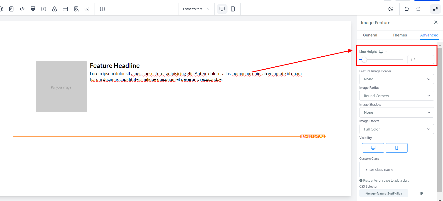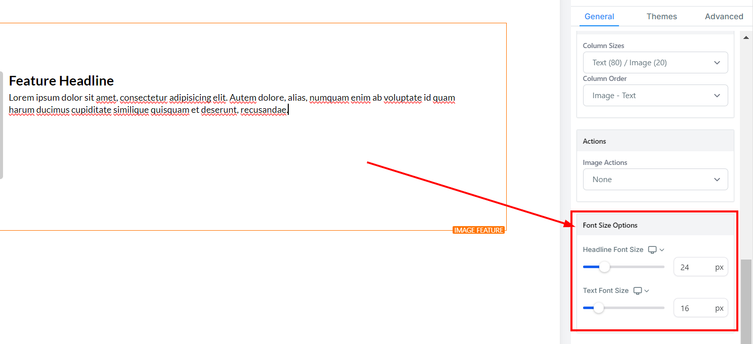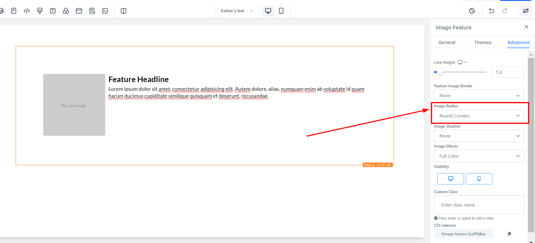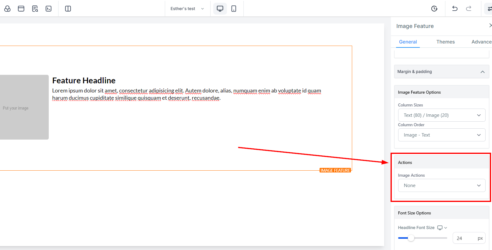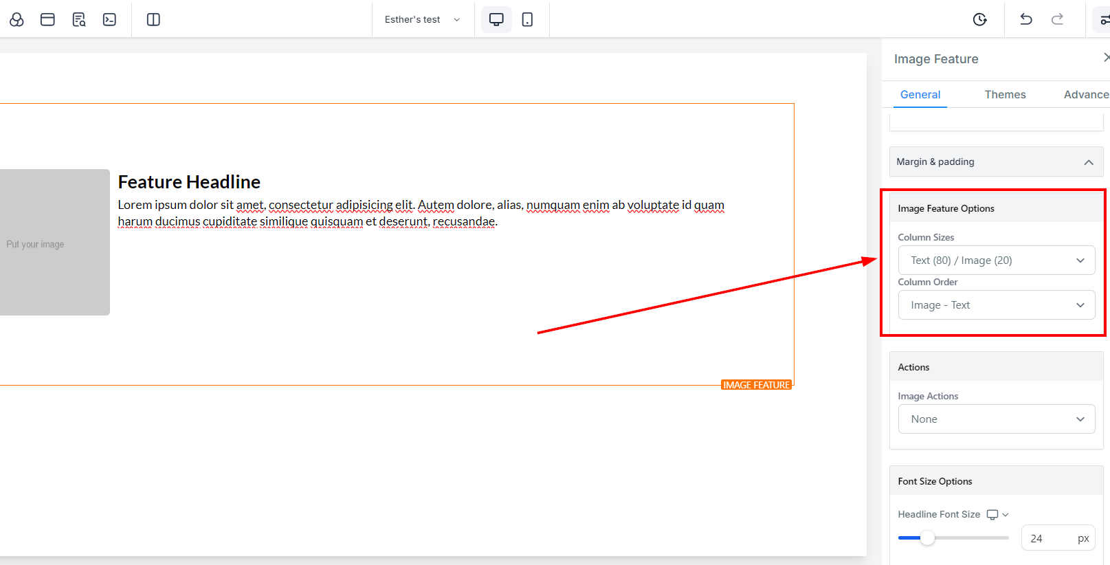 The Image Feature element allows you to add an image with a headline and text element. Utilize this option when adding team member highlights or product/service highlights to your funnel and website pages. On the left-hand side of the page, you will see various customization options for your Image Feature that we will review here.