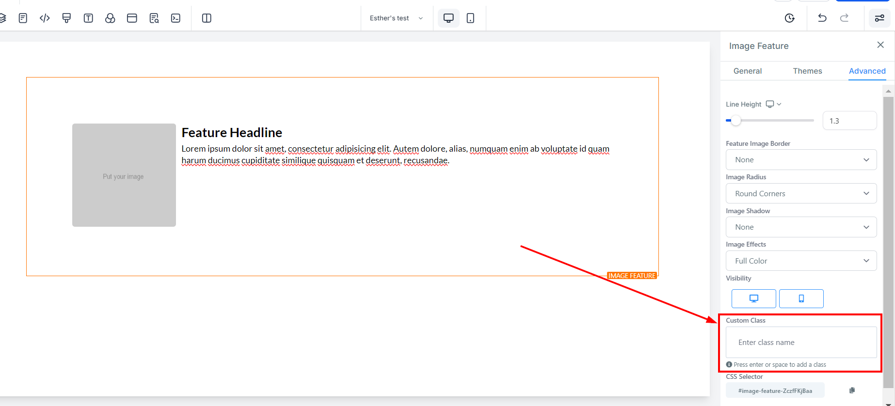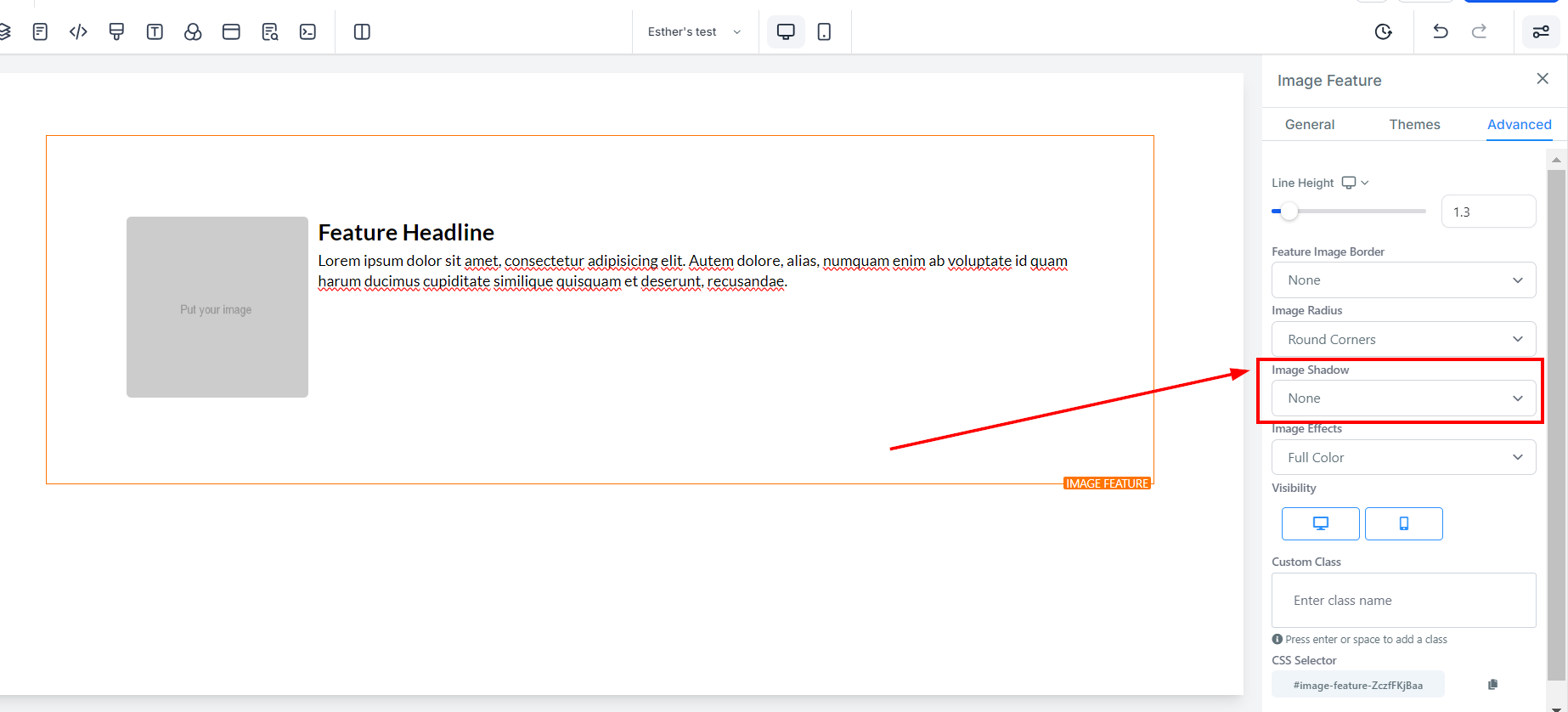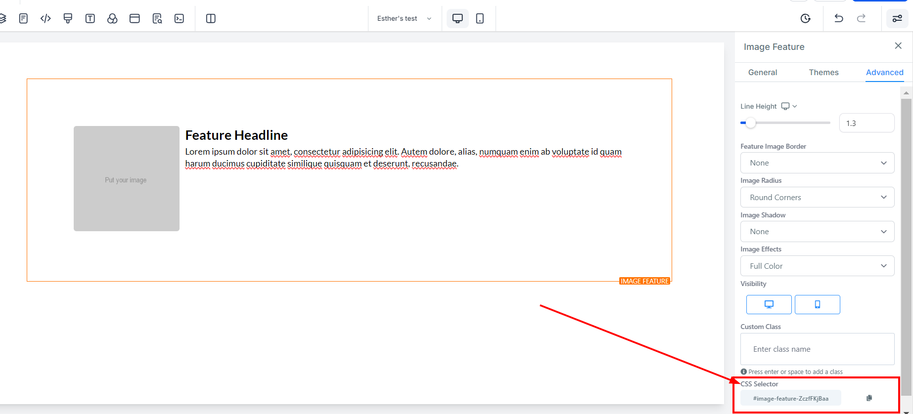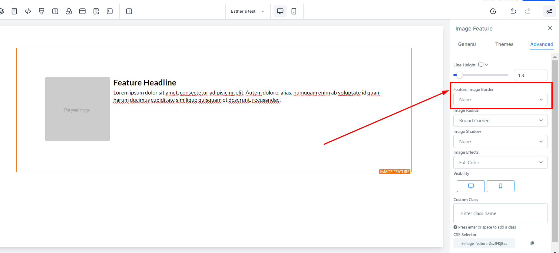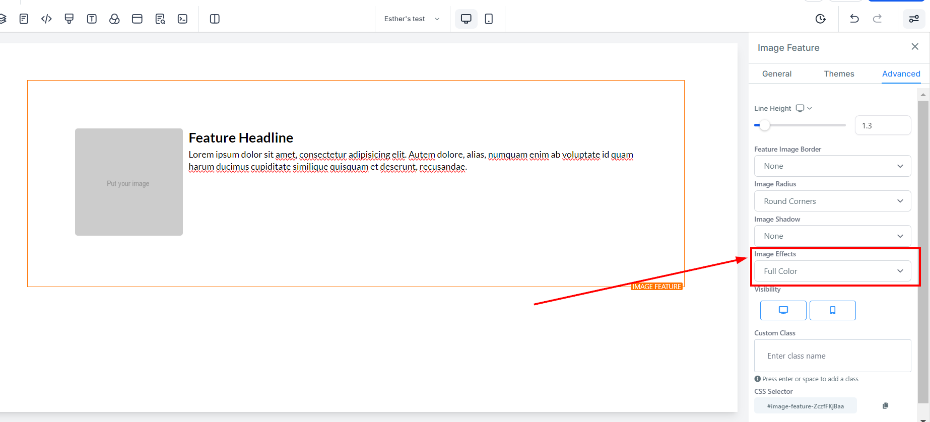 The Image Feature element allows you to add an image with a headline and text element. Utilize this option when adding team member highlights or product/service highlights to your funnel and website pages. On the left-hand side of the page, you will see various customization options for your Image Feature that we will review here.