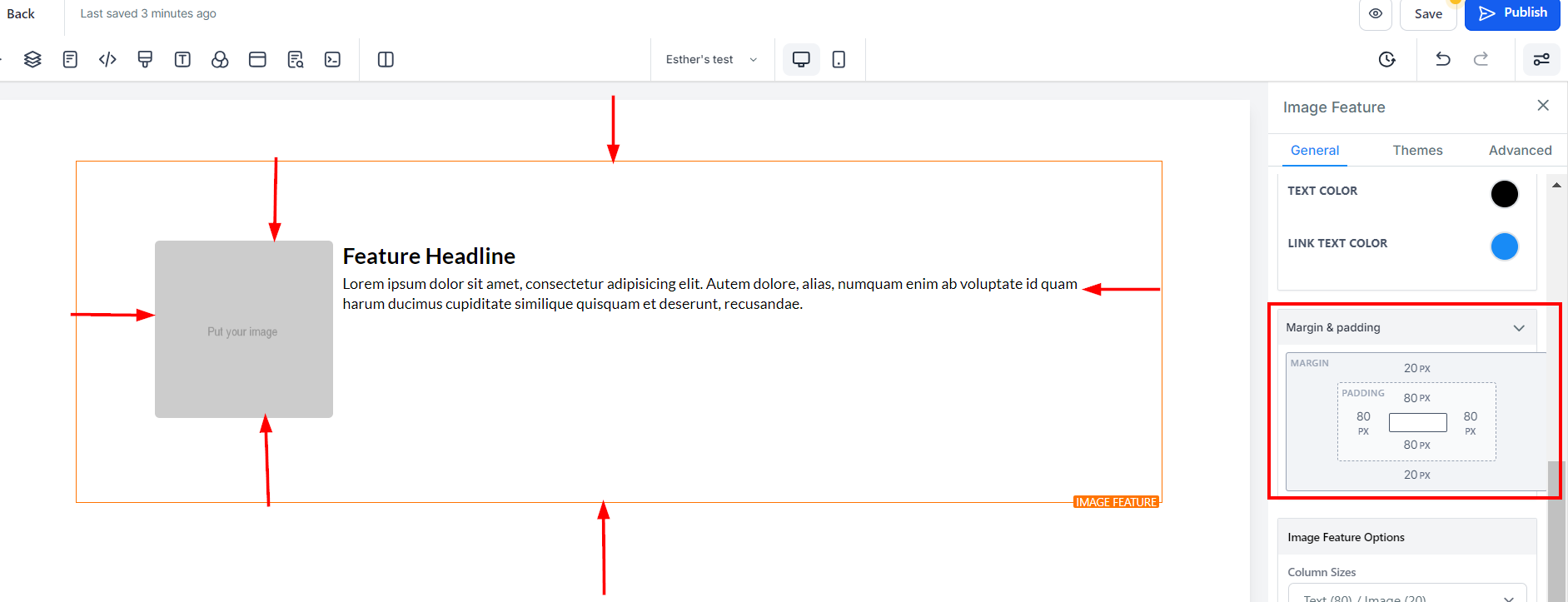 To adjust the top or bottom margin of your content, use the Margin Top or Margin Bottom toggle bars.