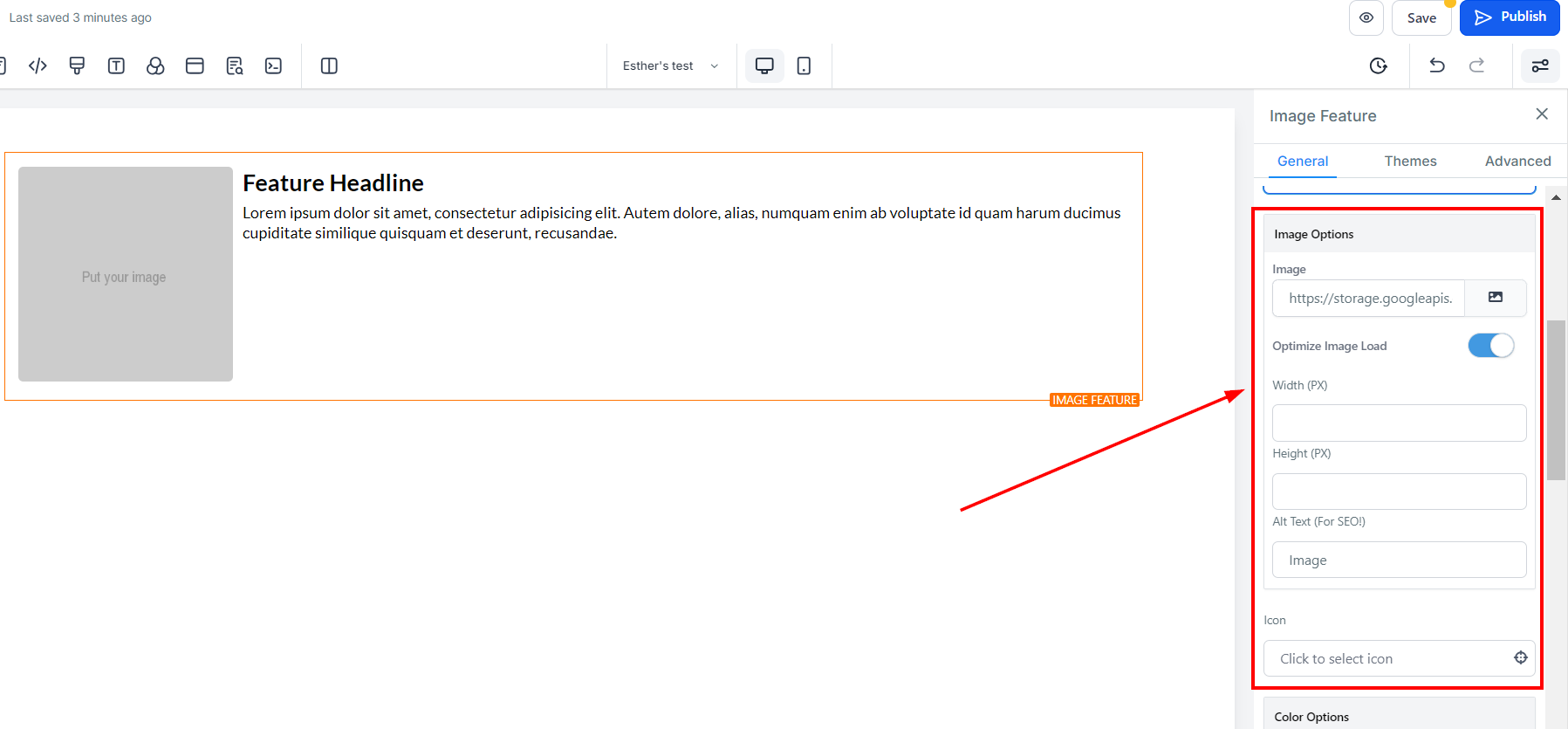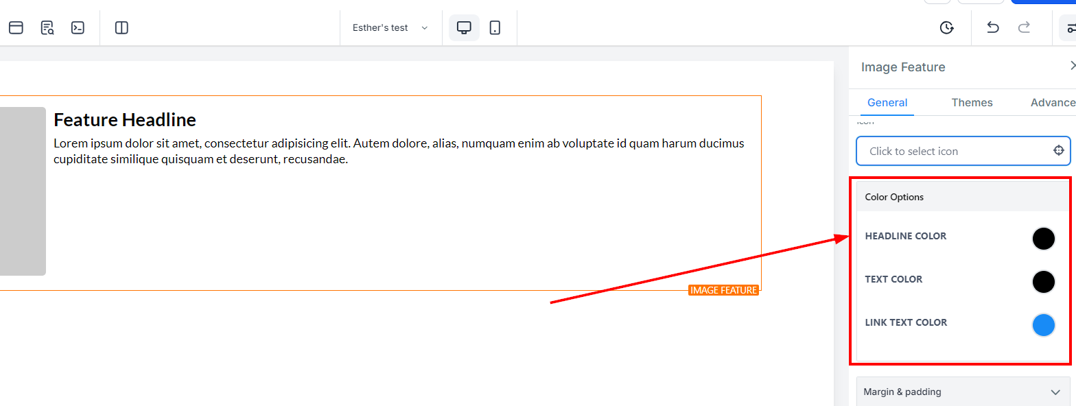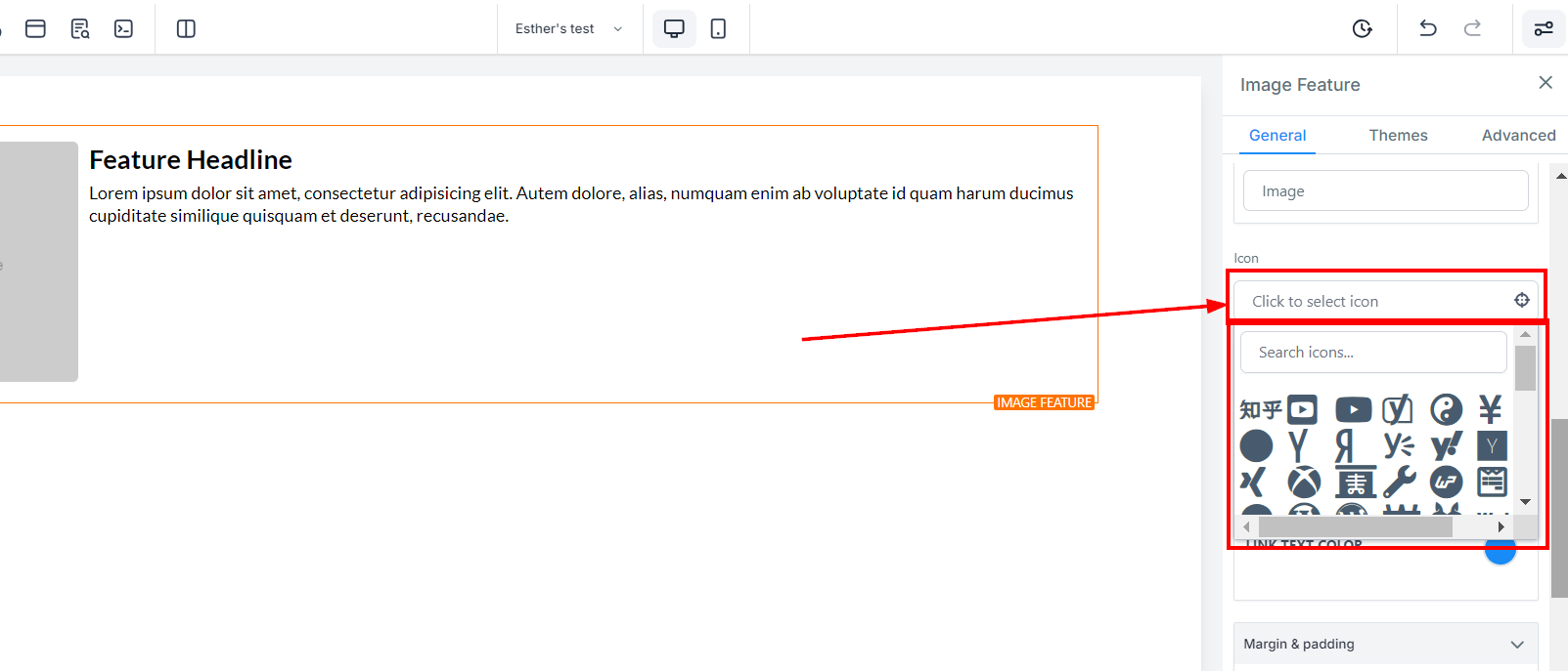 To add an icon to your Image Feature, simply select from the list of available icons. If you have a specific icon in mind, you can type it into the search bar to narrow down the options. This icon will appear next to the image feature headline text.