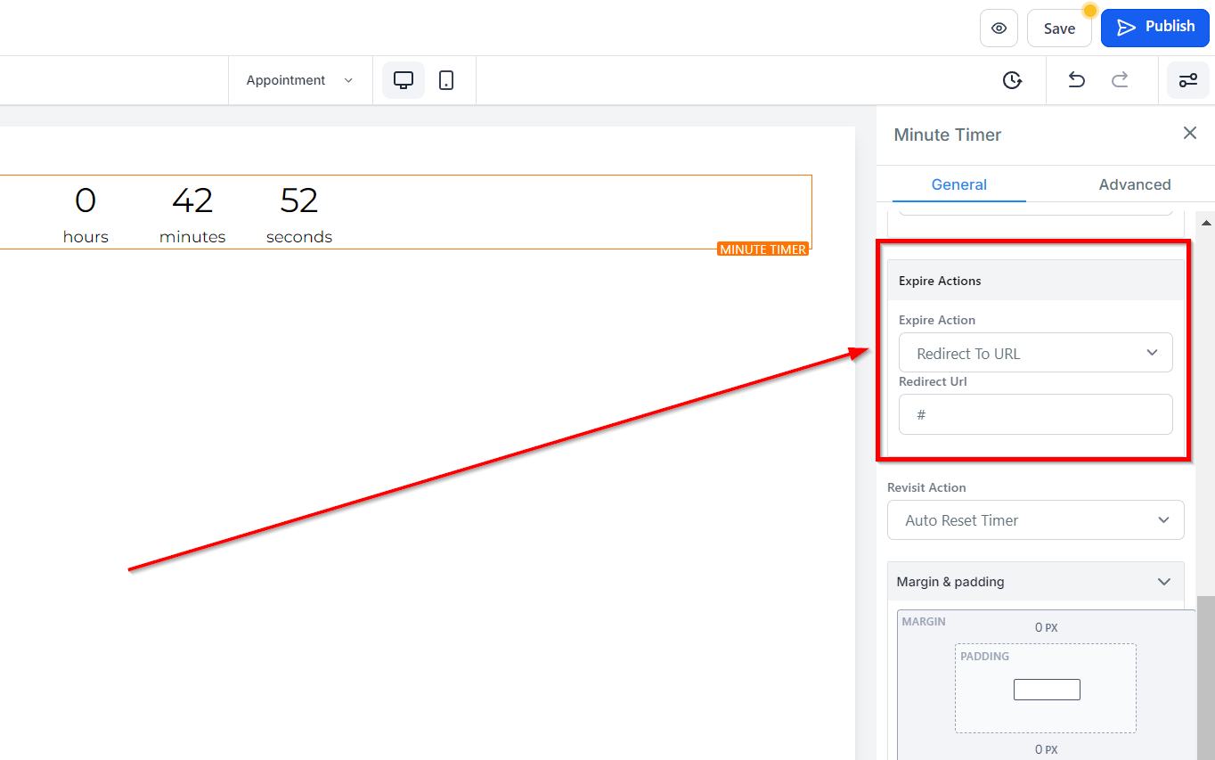 With the Revisit Action feature, you can choose what happens when a user revisits your page after the timer expires. Customize the behavior by setting an auto-reset timer, Hide/ show an element, or auto-expire for X days.