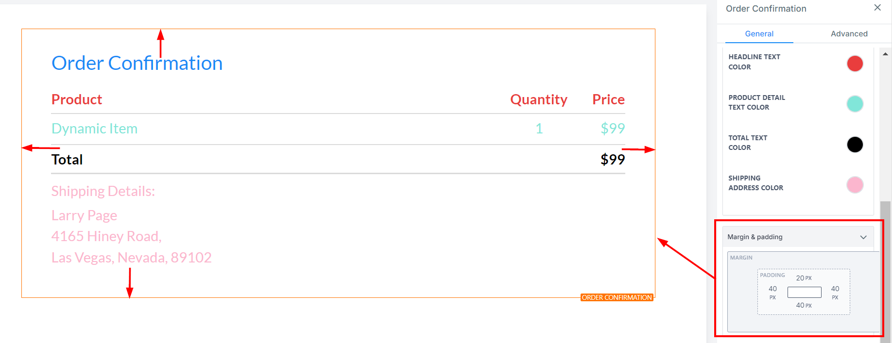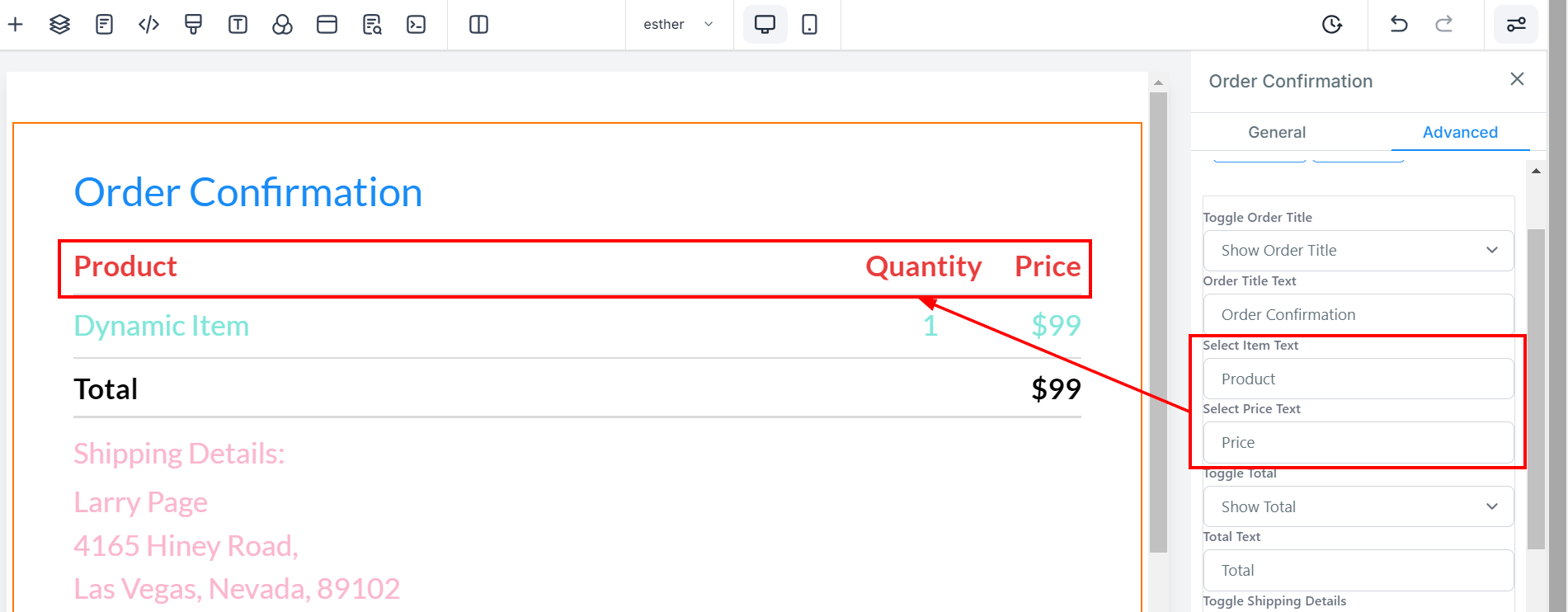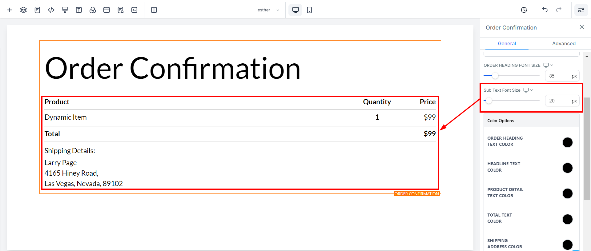 The Order Confirmation element allows you to add an order confirmation to your funnel page. This is useful when taking orders in a previous funnel page, and having a confirmation page be your next funnel step. When you add this element, you will notice a variety of customization options on the left-hand side of the builder.