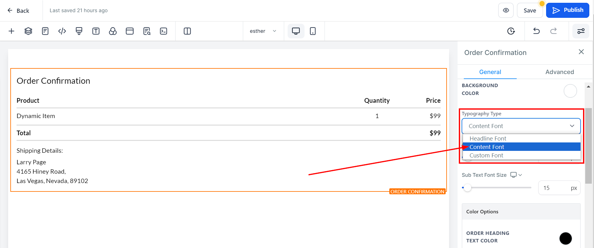 The Typography Type dropdown will allow you to select the font you would like to use for your order confirmation element. You can choose from the headline or content font you set up in settings, or select custom font. If selecting a custom font, you will be able to click Default Font and choose from a variety of different font options.