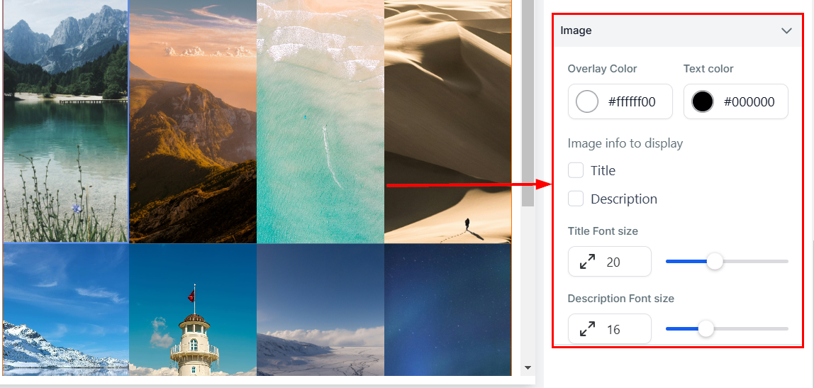 In the Image section, you can choose your overlay color and text color, opt to display the image title or the description and adjust the font sizes of the title and description.