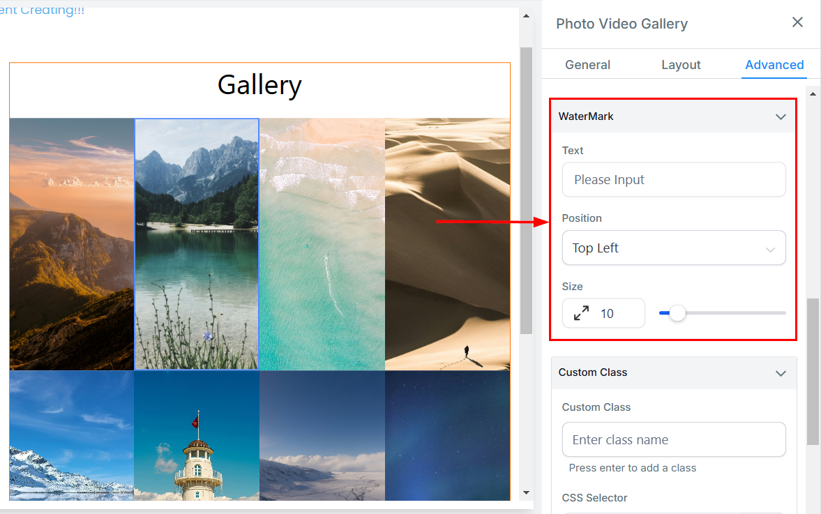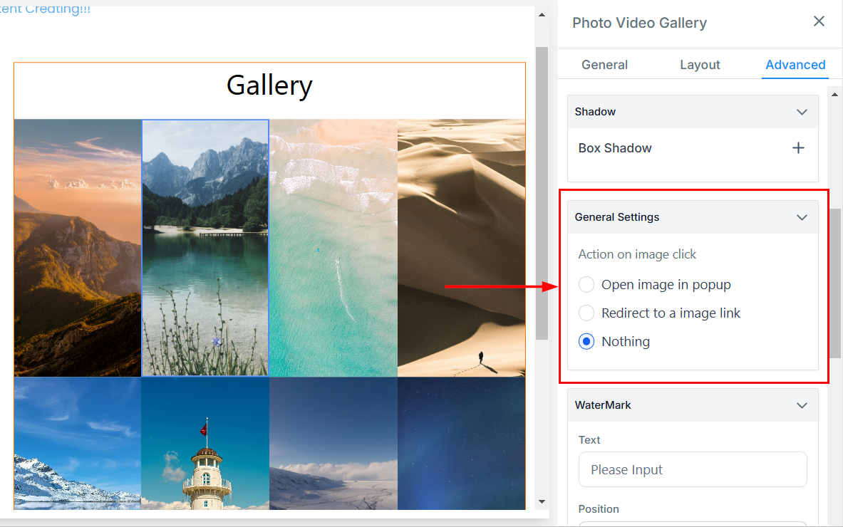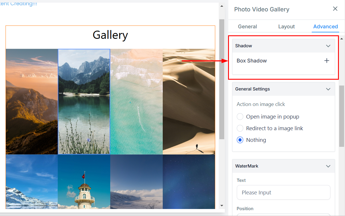 In the Advanced section, you can adjust the Size, Margin & Padding, Shadow, General Settings, Watermark, and Custom Class Settings of the Photo Gallery.