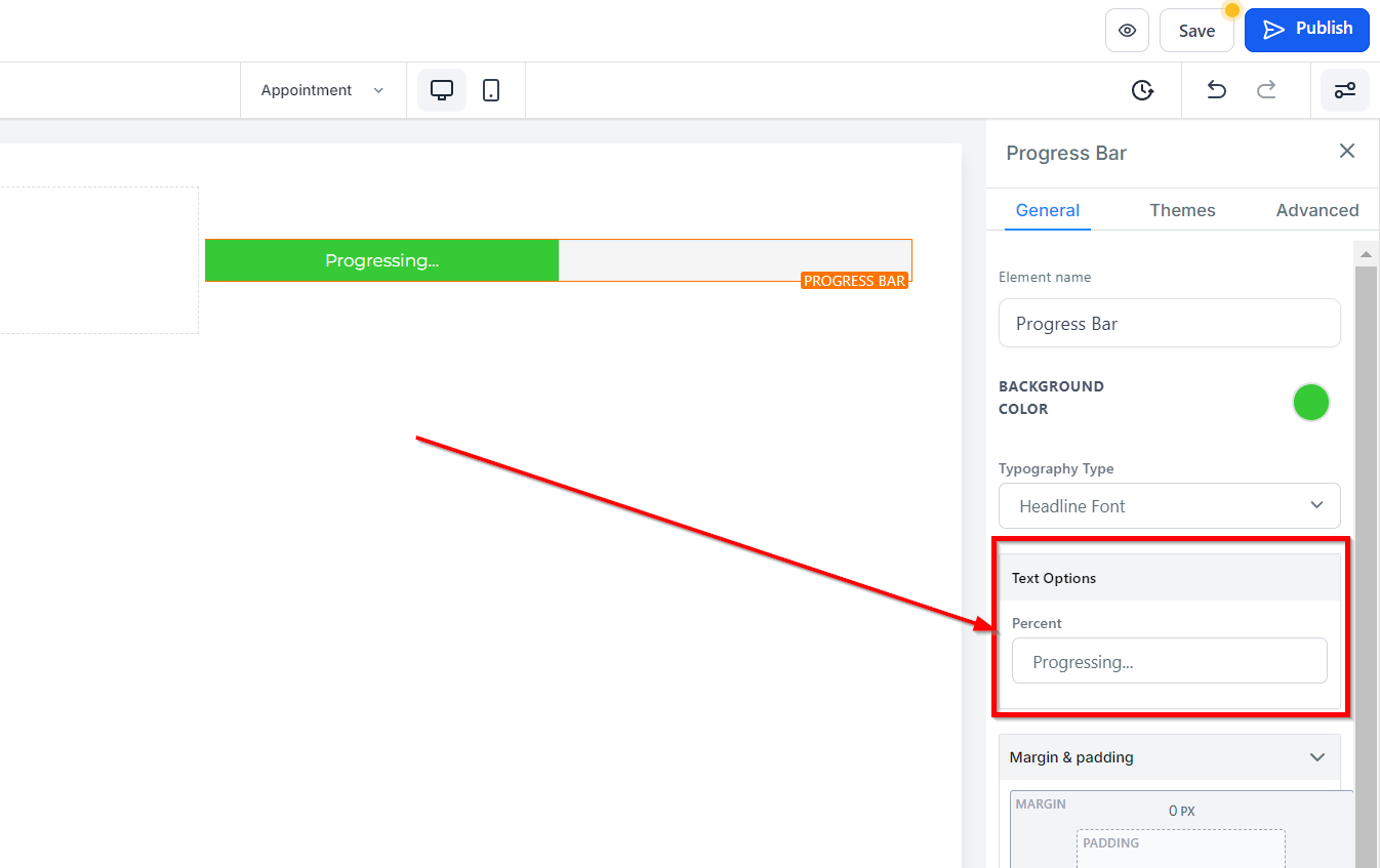 With the Percent Width dropdown, you can choose how wide you would like your progress bar to be within the element box. You can choose from 0 percent up to 100 percent.
