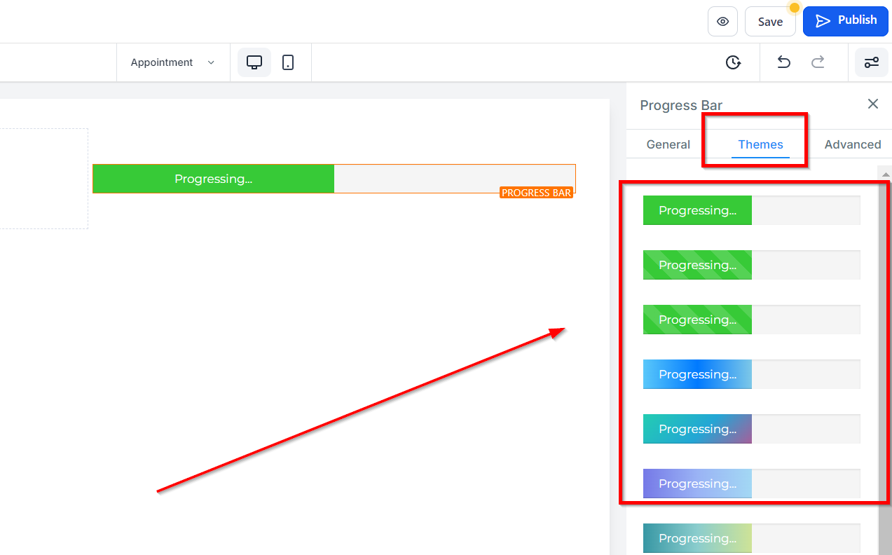 Visit the Themes tab to choose one of the available themes for your progress bar. Note that when you select a theme, the color options you choose in the previous step will be replaced with the theme colors. If you wish to undo the action after selecting a theme and would like to go back to what you had previously selected, click on the undo action button on the toolbar at the top of the builder.