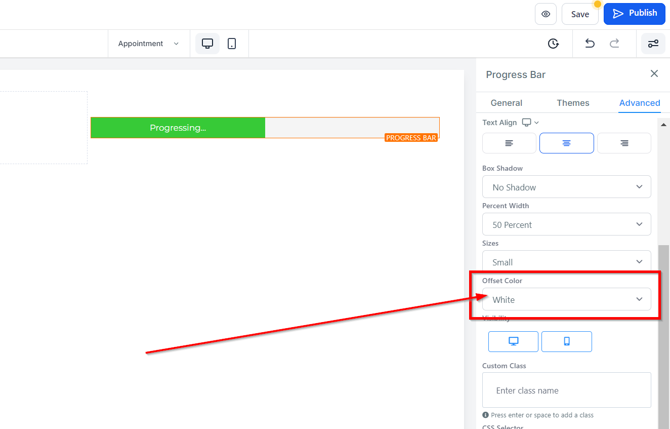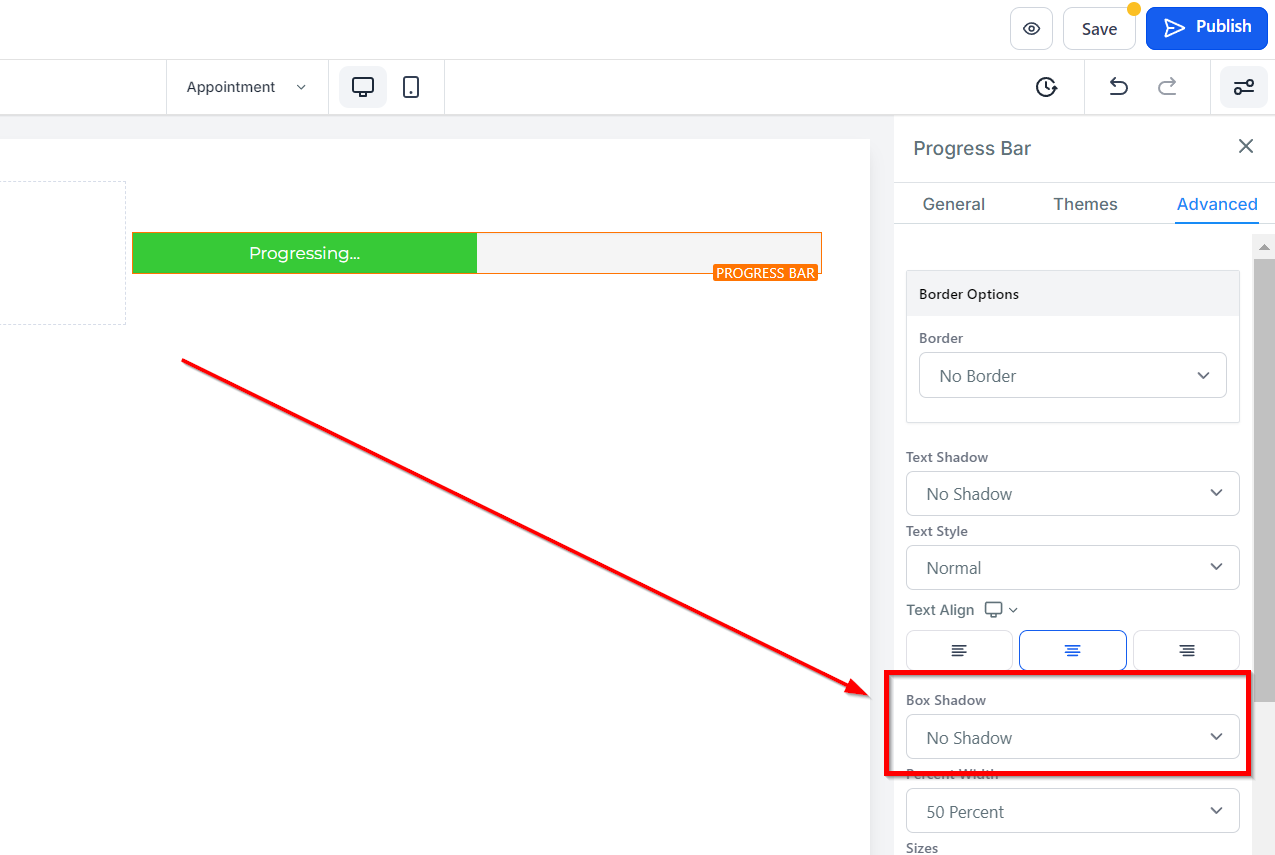If you would like to add a box shadow around your progress bar, select the dropdown and choose from your options of drop shadow or inner shadow. You will see various intensities of shadows, so play around with them to see which one fits your needs the best.