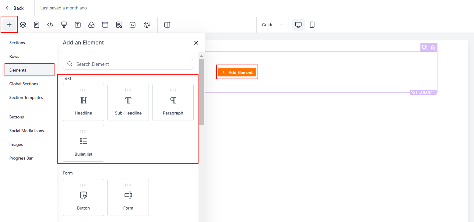 Inside the builder click the plus sign button, this will open your element menu for you to drag and drop your text element. The size order from larger to smallest is Headline, Sub-Headline, Bullet list, and Paragraph.